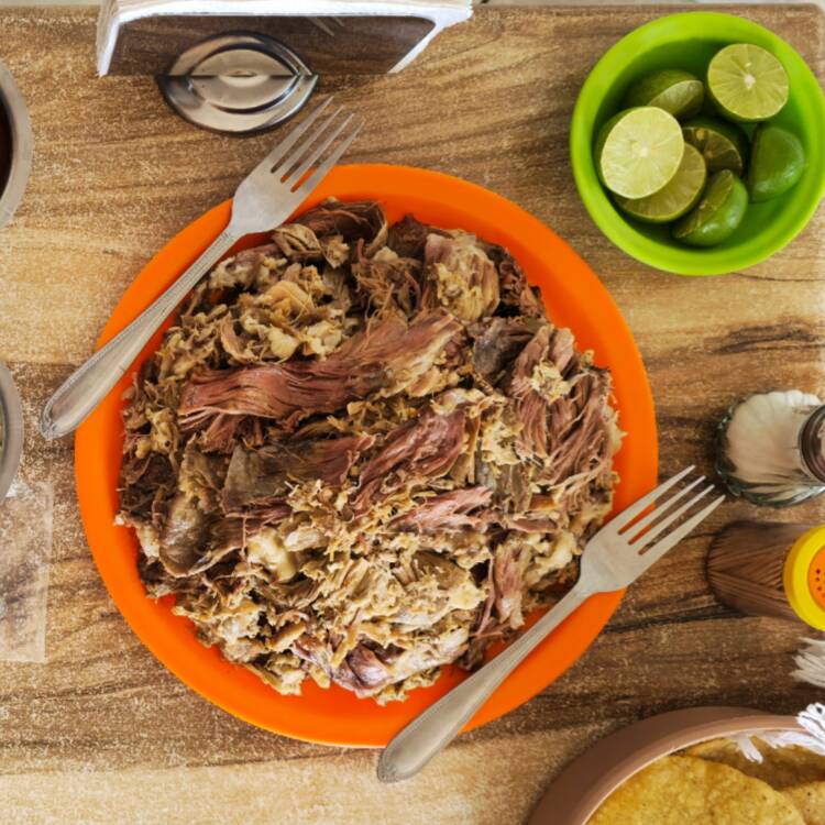 750 gramos de barbacoa de borrego. Elige si la prefieres surtida (con grasita) o maciza.