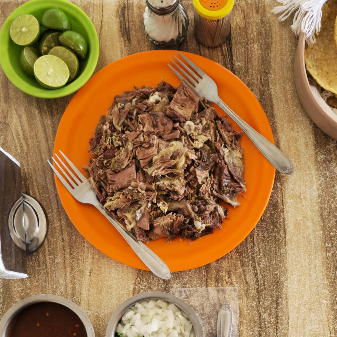 1 Kilo de barbacoa de borrego, acompañado de salsa roja, cebollitas con cilantro y limones.