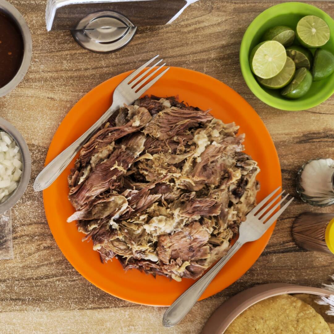 1/2 Kilo de barbacoa de borrego, acompañado de salsa roja, cebollitas con cilantro y limones.