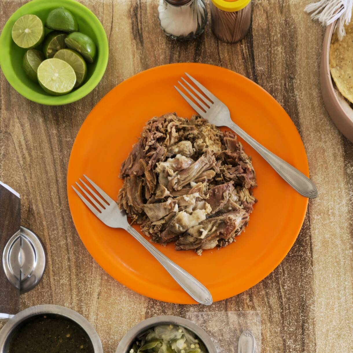 1/4 de Kilo de carnitas, acompañadas de salsa verde, cebollitas con chile manzano y limones.