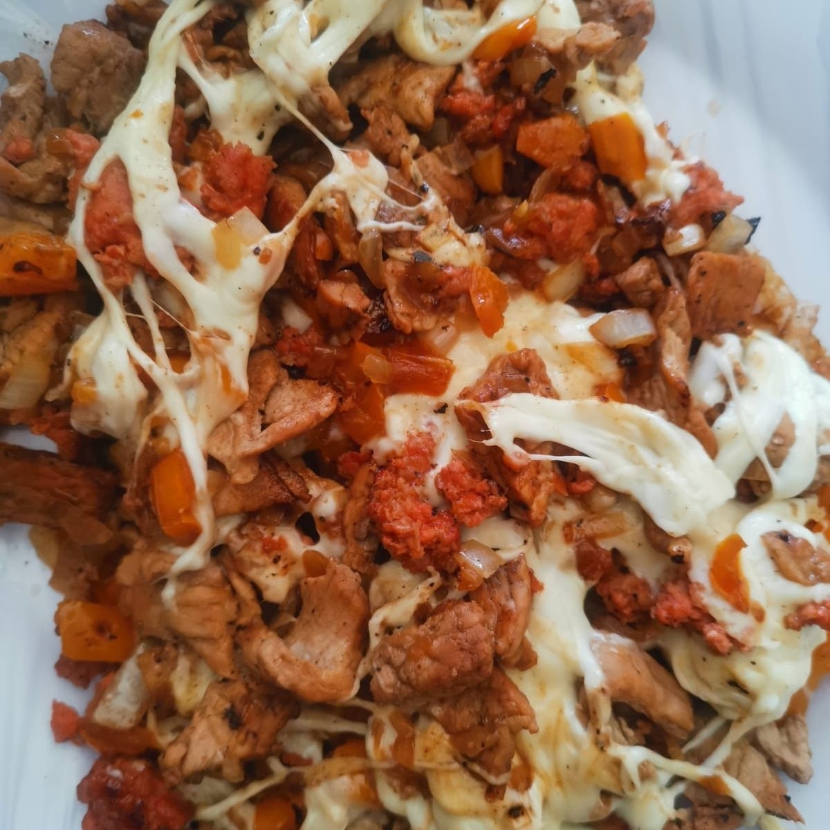 Morrón, cebolla, quesillo, bistec, salchicha y tocino.