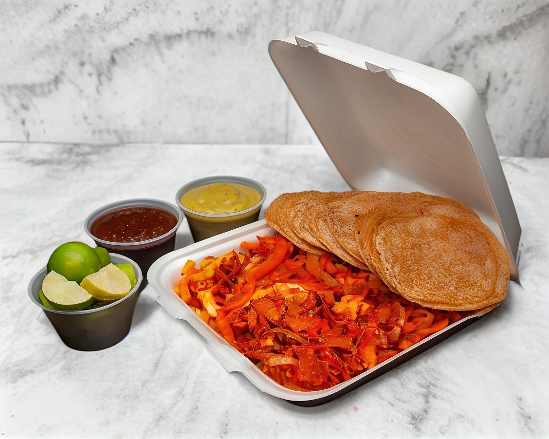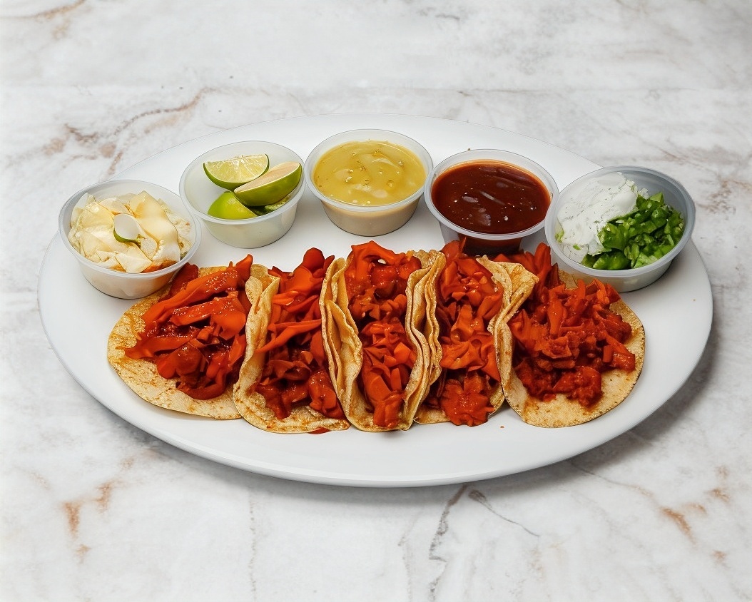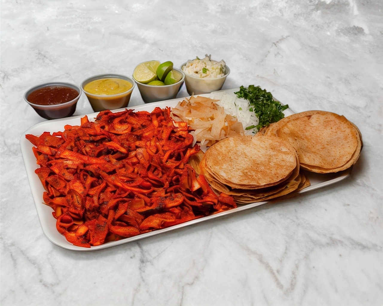 MEDIO KILO DE CARNE DE PASTOR, 1/2 KILO DE TORTILLAS DE MAÍZ, CEBOLLA ASADA, CEBOLLA Y CILANTRO FRESCO, SALSA DE AGUACATE, SALSA DE CHIPOTLE Y LIMONES.