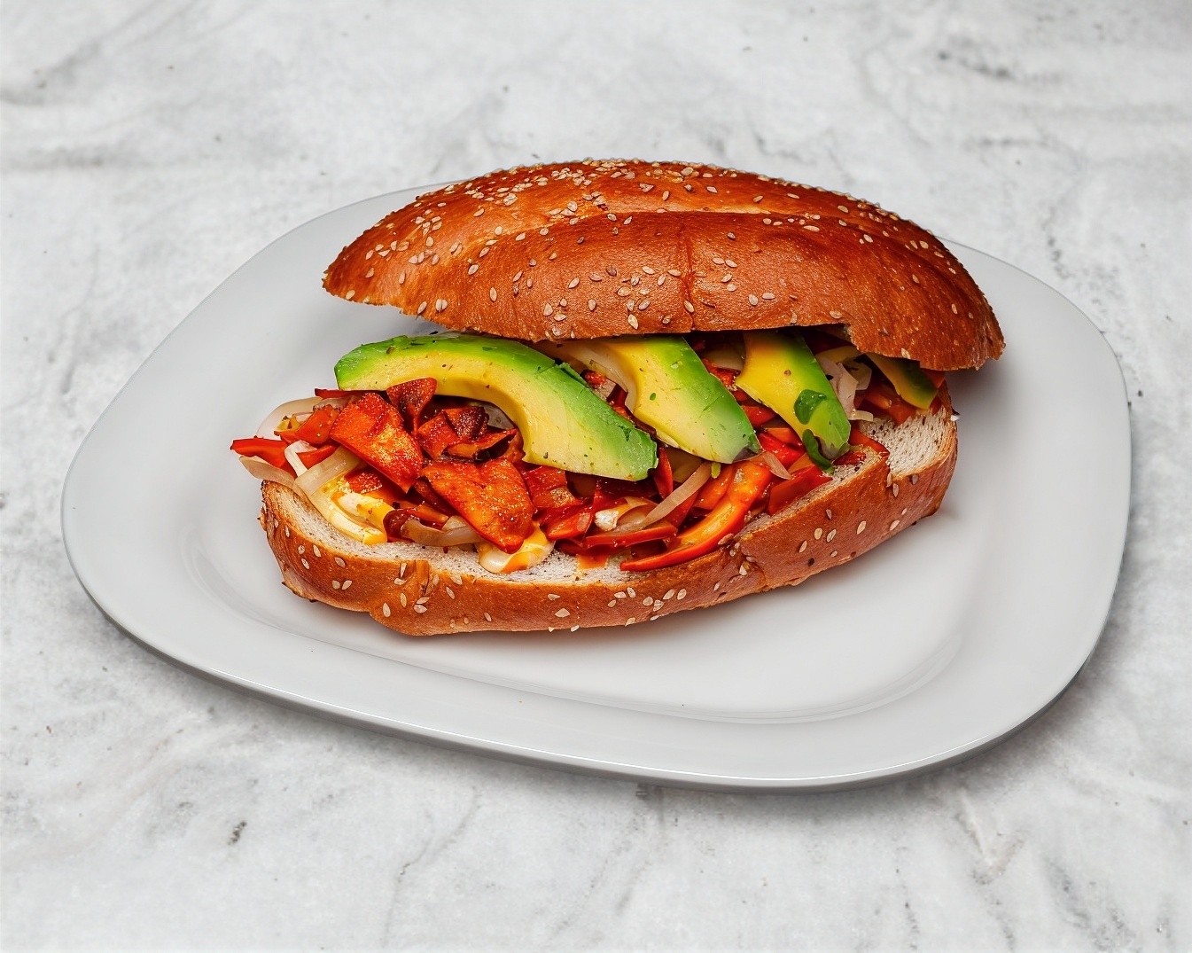 TORTA GIGANTE (BOLILLO TAMAÑO FILOS) CON CARNE DE PASTOR, AUTENTICO QUESO OAXACA GRATINADO, CEBOLLA COCIDA Y AGUACATE.