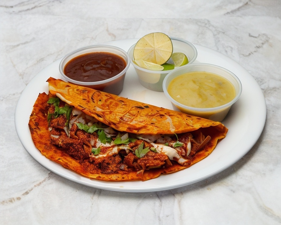 ELABORADA CON TORTILLA DE MAÍZ HECHA A MANO, BAÑADA EN CONSOMÉ DE BIRRIA, TAMAÑO DE TORTILLERÍA, AUTÉNTICO QUESO OAXACA GRATINADO CEBOLLA ASADA Y CARNE DE BIRRIA PESO APROX. 120 GM.