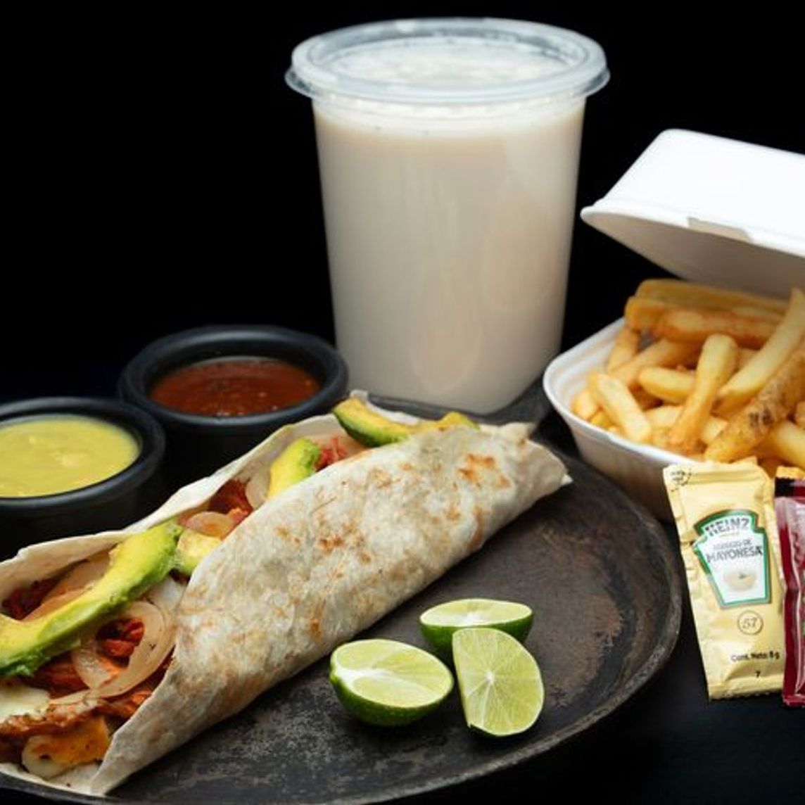 UN GUSANO DE PASTOR(BURRITO), 100 GR DE PAPAS A LA FRANCESA Y UN LITRO DE AGUA.
