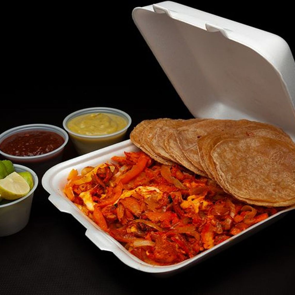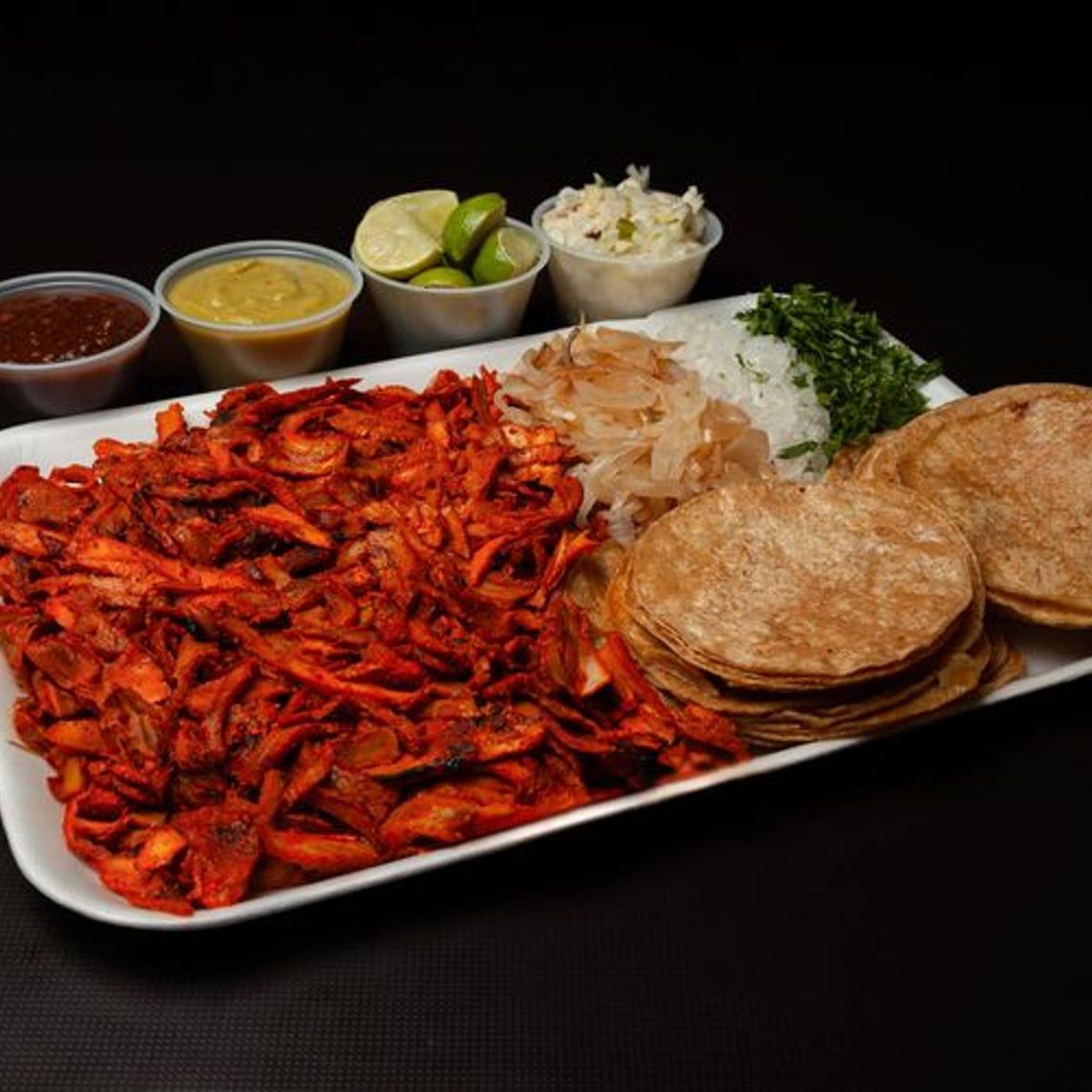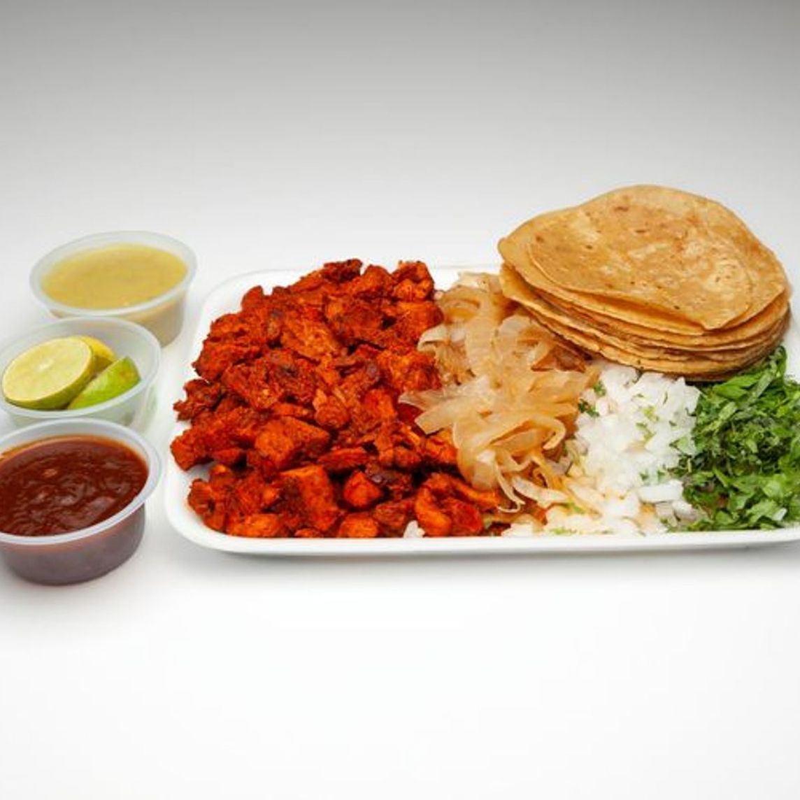 MEDIO KILO DE CARNE DE PASTOR, 1/2 KILO DE TORTILLAS DE MAÍZ, CEBOLLA ASADA, CEBOLLA Y CILANTRO FRESCO, SALSA DE AGUACATE, SALSA DE CHIPOTLE Y LIMONES.