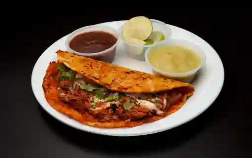 Quesadilla con tortilla de maíz, bañada en salsa de birria y rellena de carne de birria. Incluye salsa verde y roja y limones por aparte.