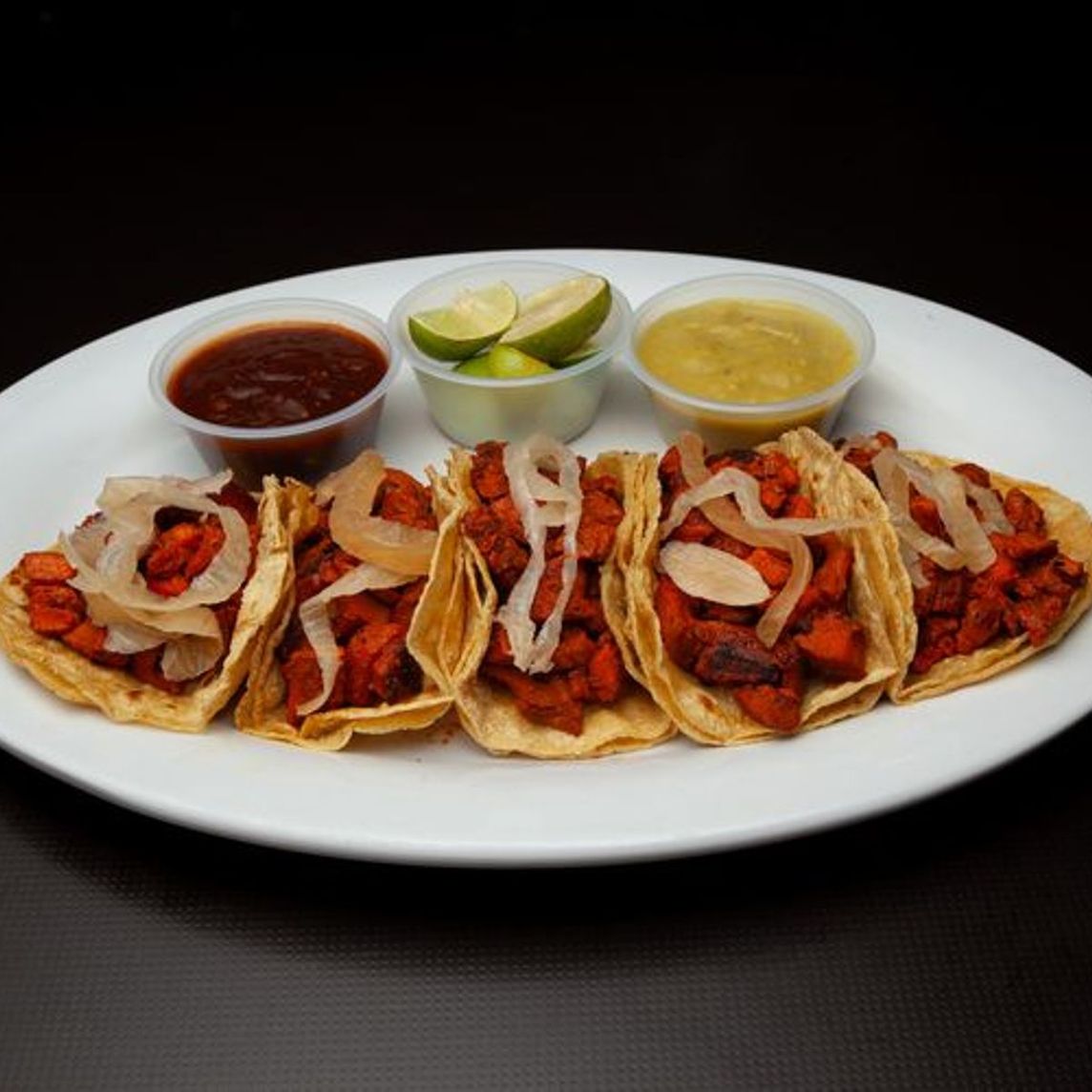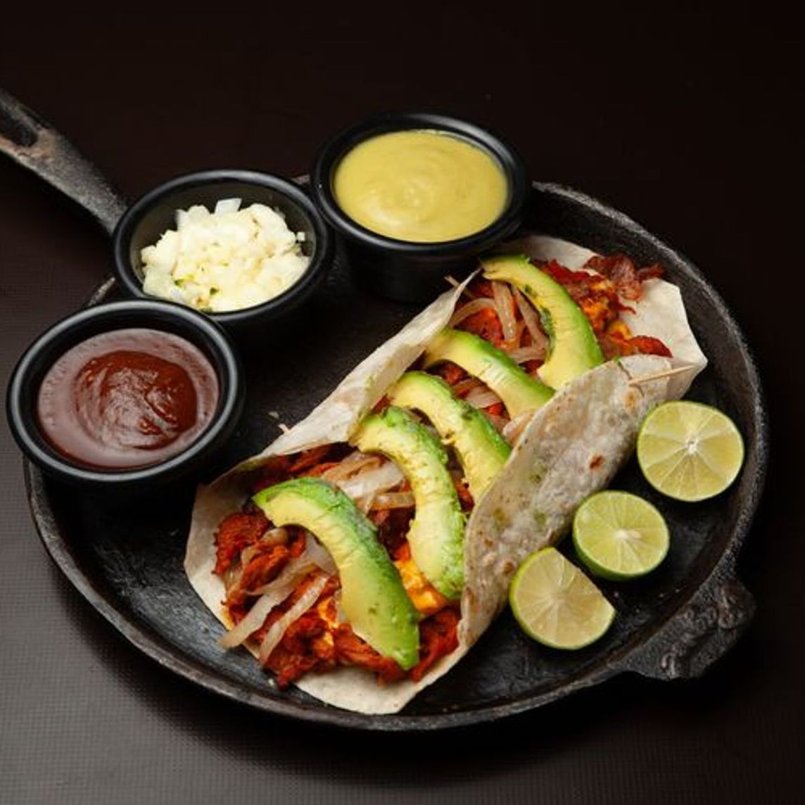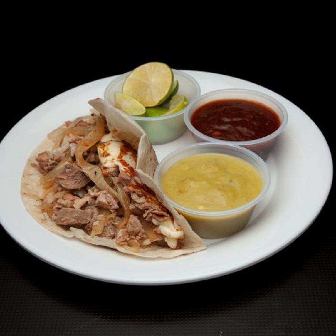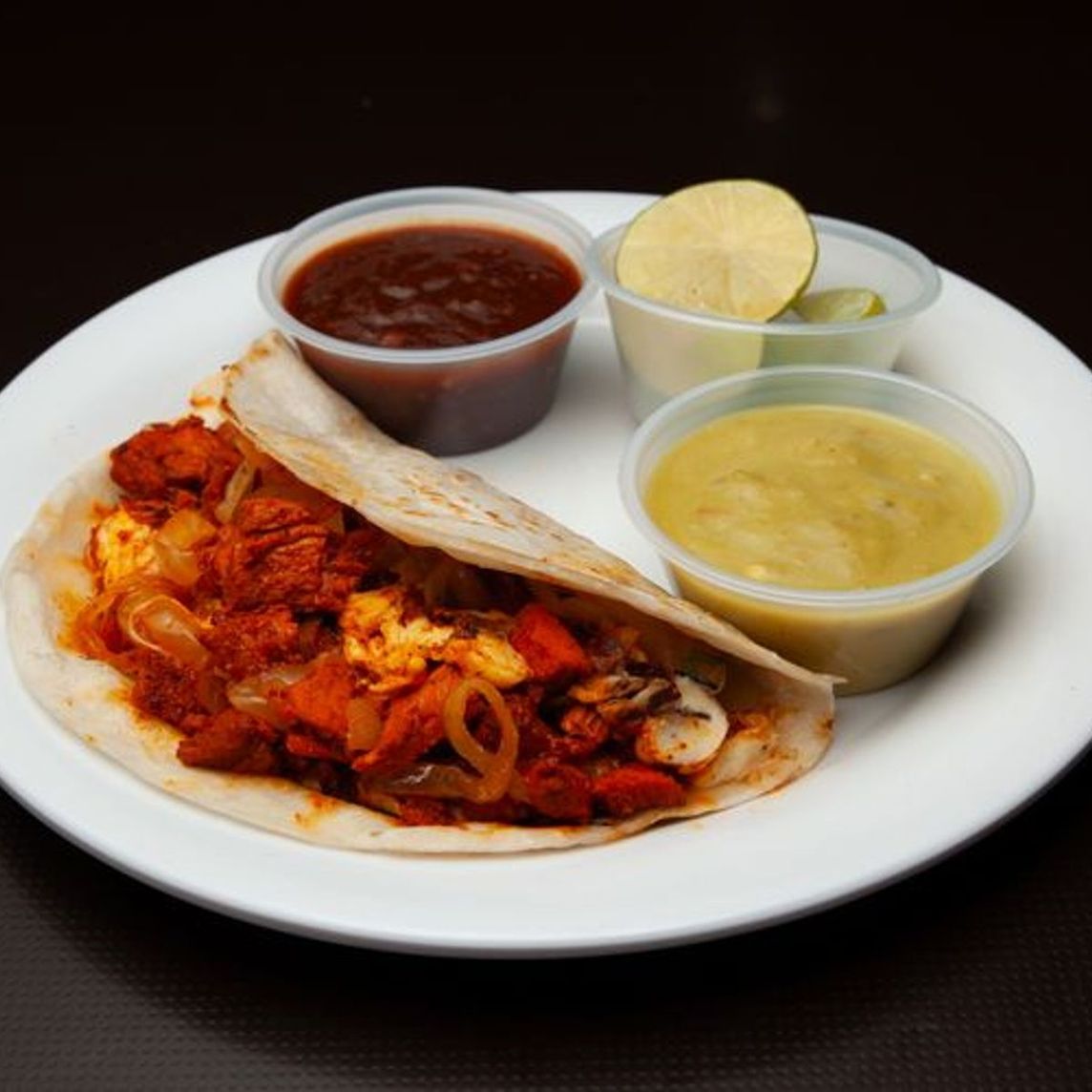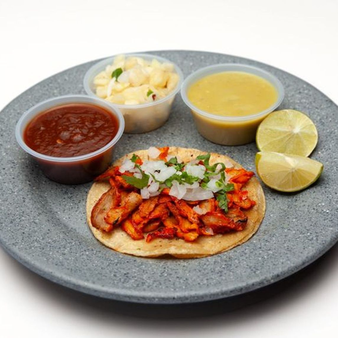 ELABORADO CON TORTILLA DE MAÍZ, JUGOSA CARNE DE PASTOR, CEBOLLA Y CILANTRO.