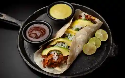 Gusano de Pastor (platillo personal): Burrito de tortilla de harina burrera de 23 cm, relleno de carne al pastor, queso Oaxaca derretido, cebolla cocida y aguacate.