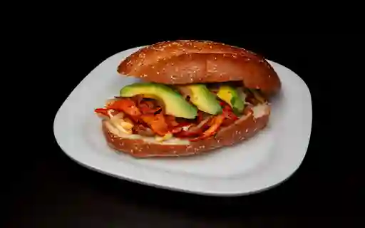 Torta con carne de pastor, queso, cebolla cocida y aguacate.