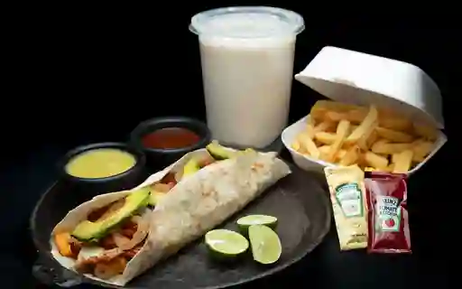 Gusano de pastor + orden de papas + agua de sabor. burrito de 25 cm con queso oaxaca derretido, carne de pastor,cebolla caramelizada y aguacate
