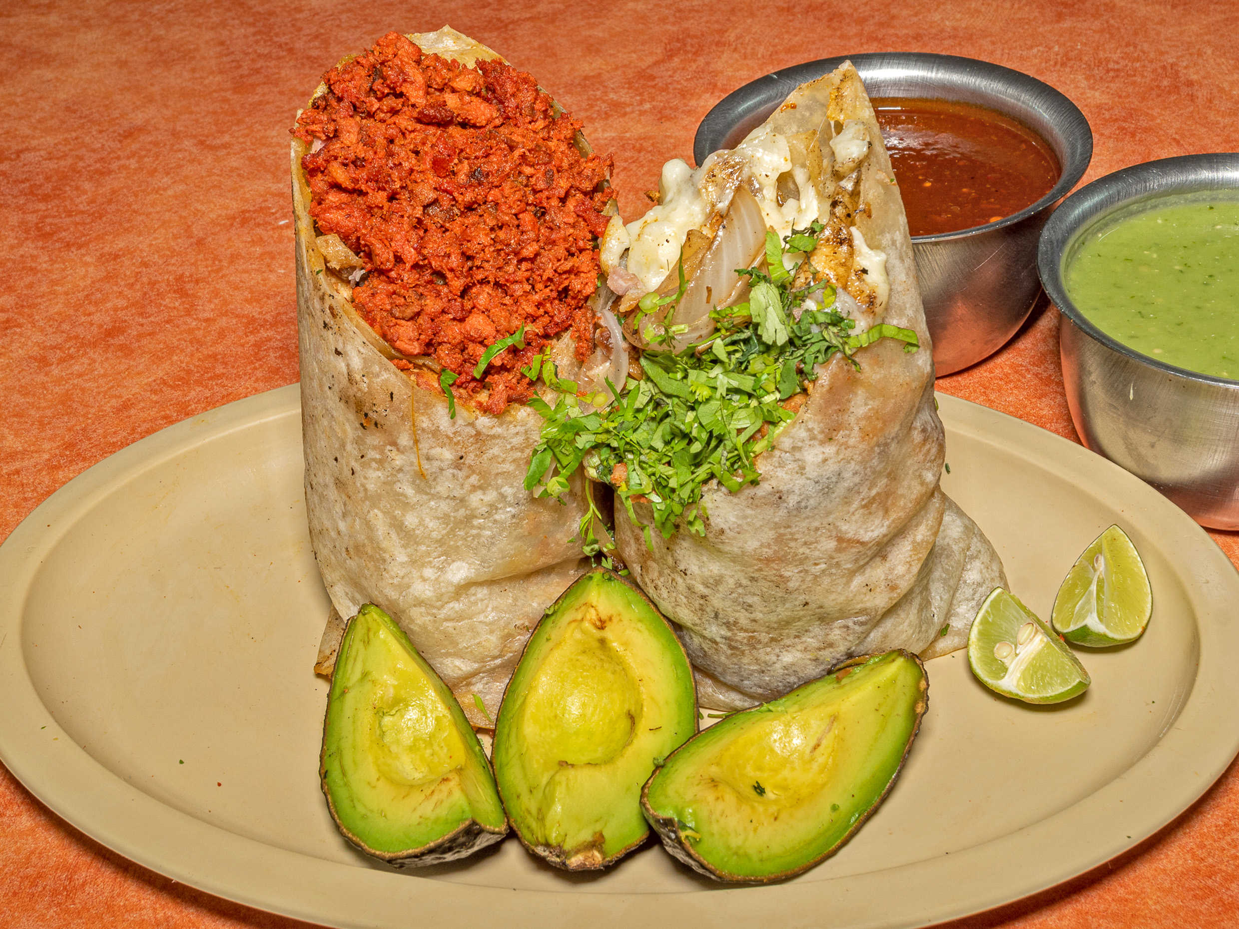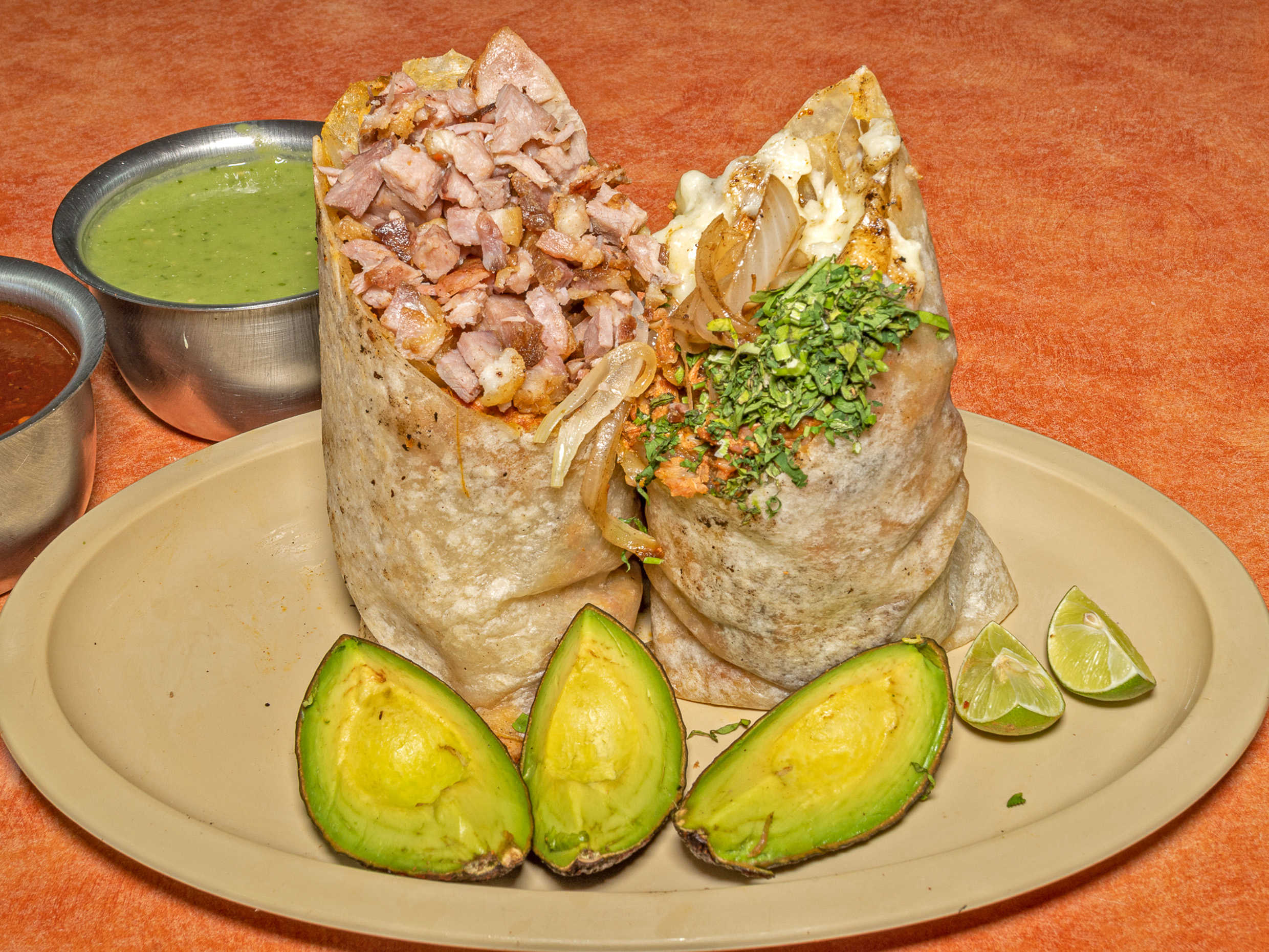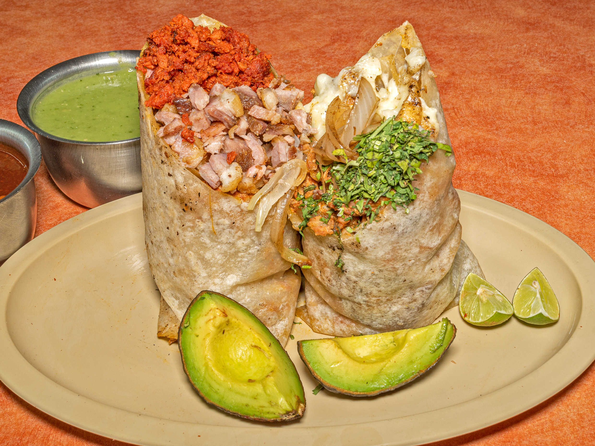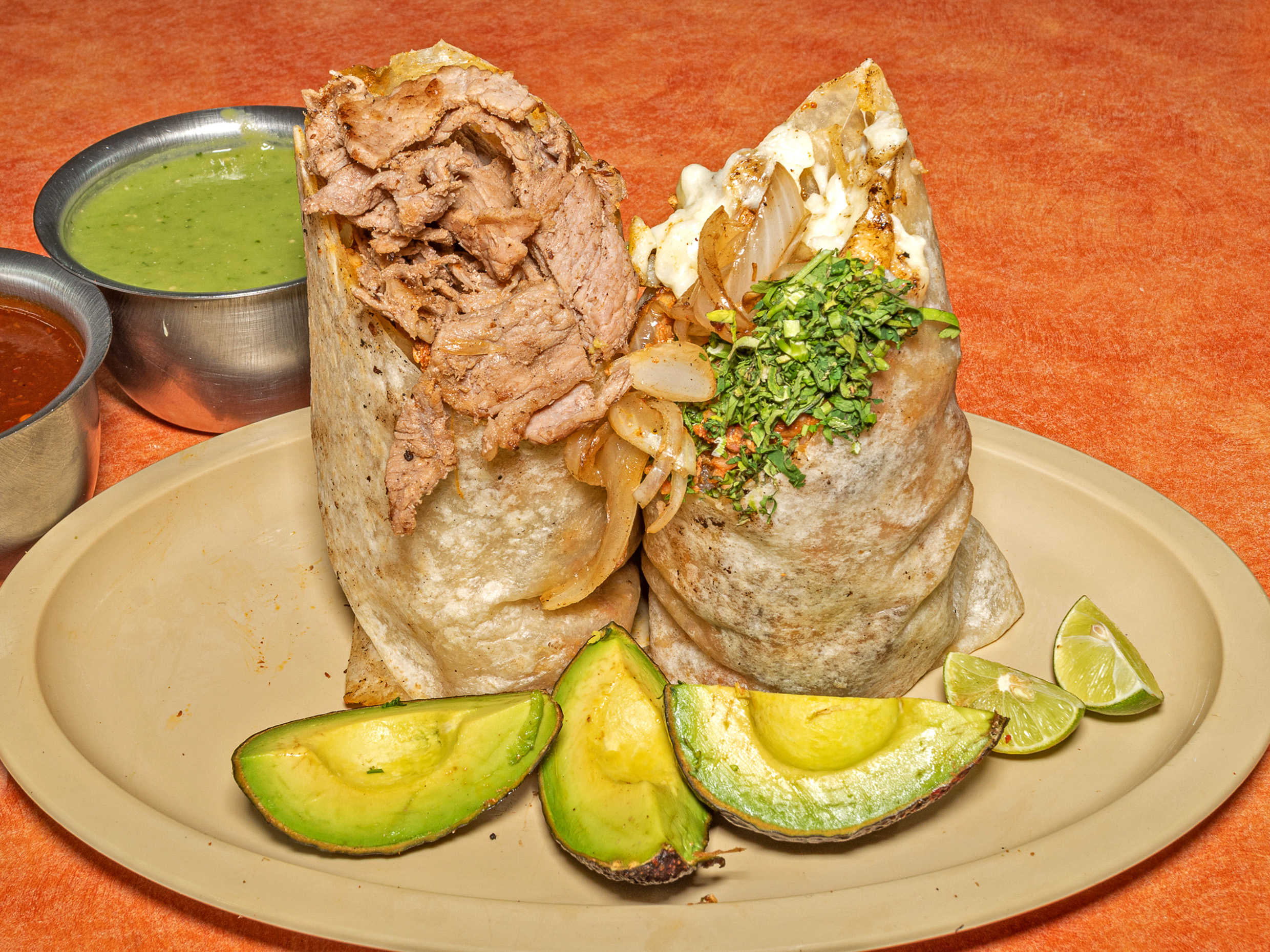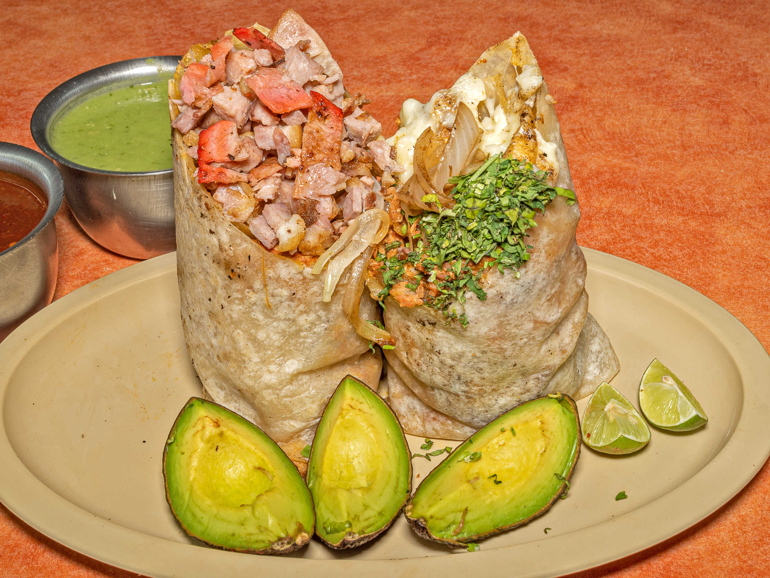 Carne selecta de arrachera (150gr), carne al pastor, jamón, tocino queso amarillo, queso oaxaca, piña, jitomate, cebolla, chiles, aguacate en un pan artesanal con ajonjolí negro. cátsup, mostaza y mayonesa.