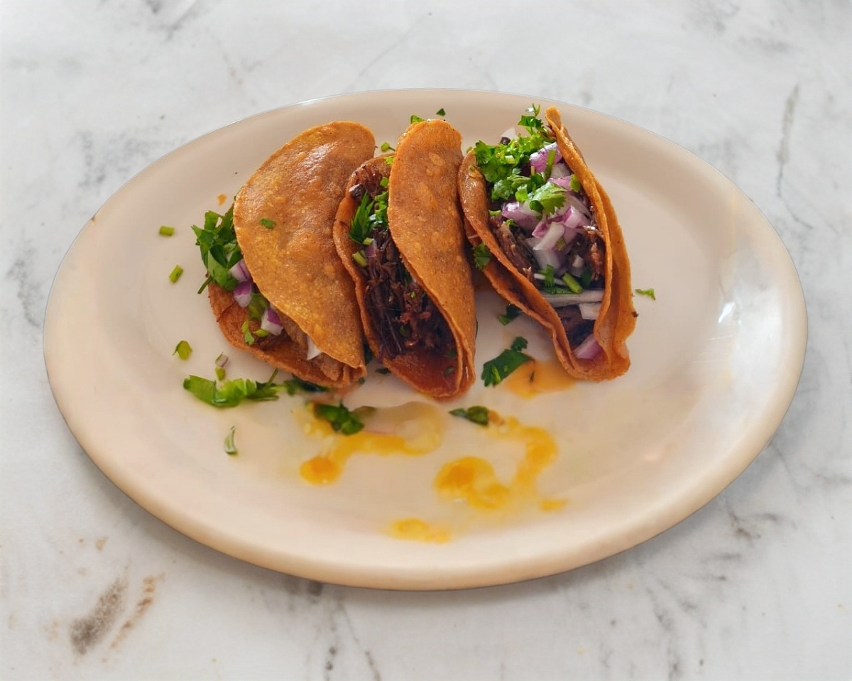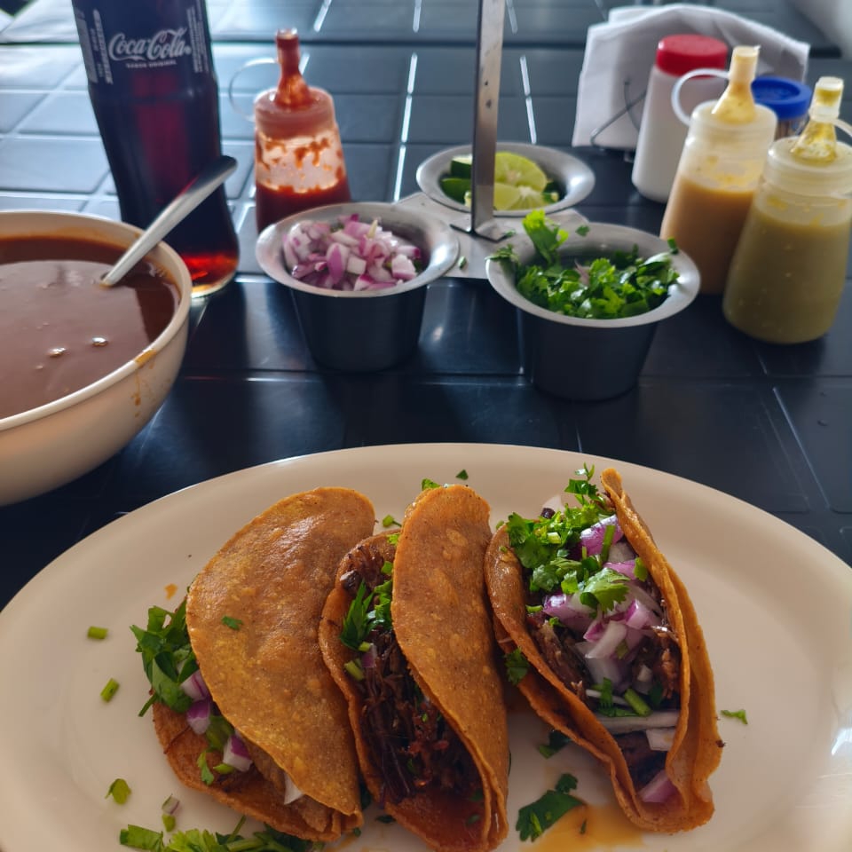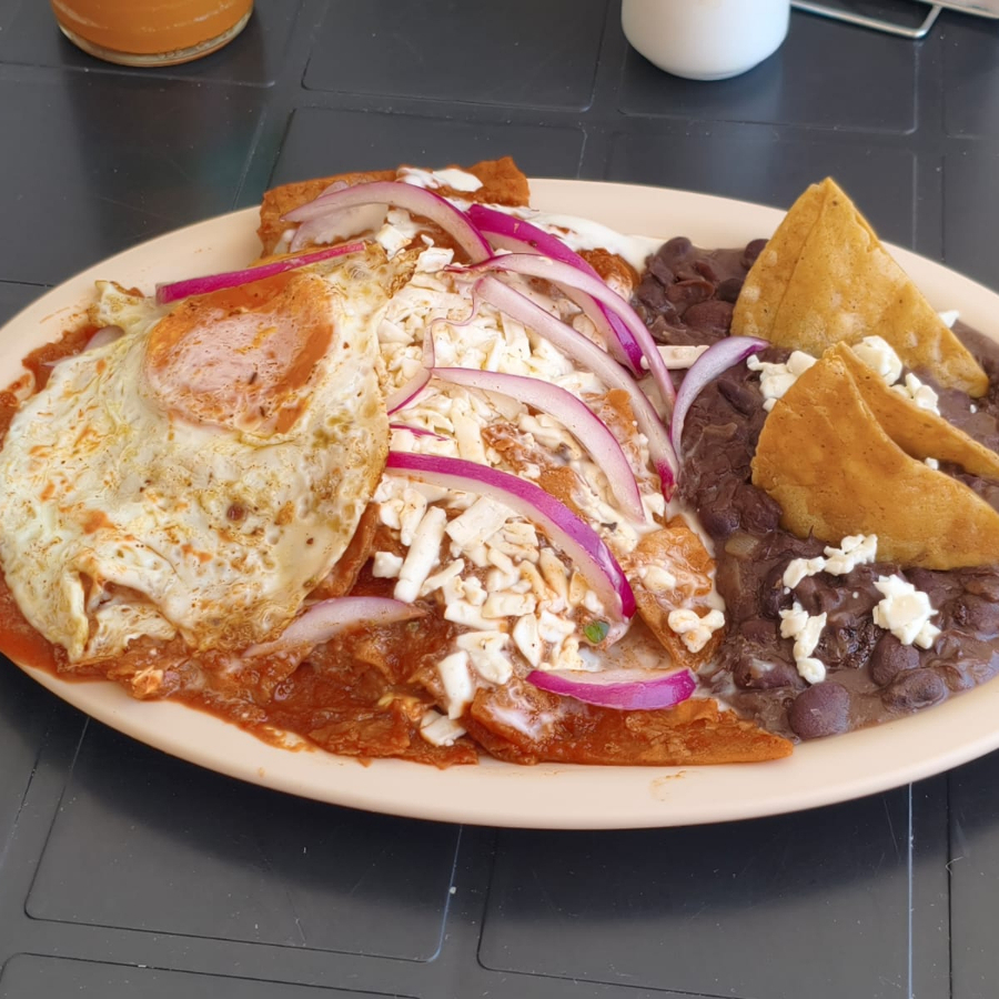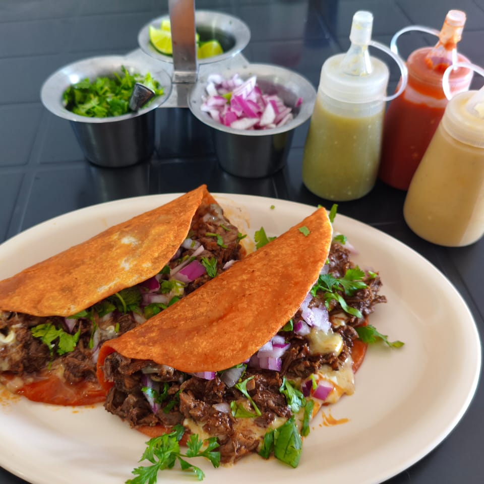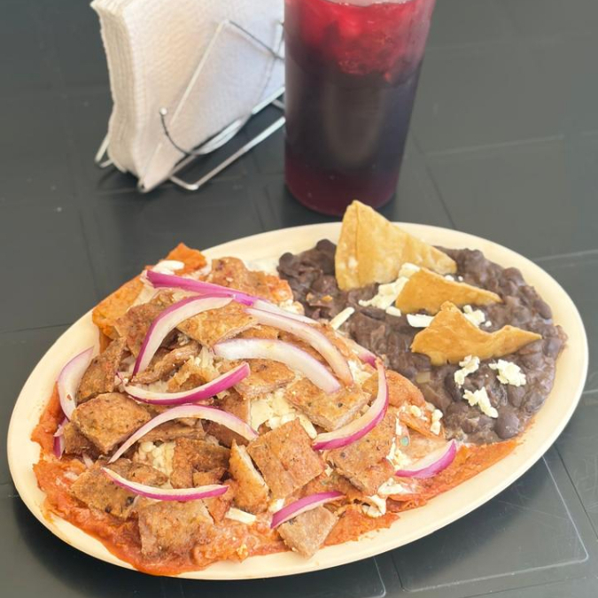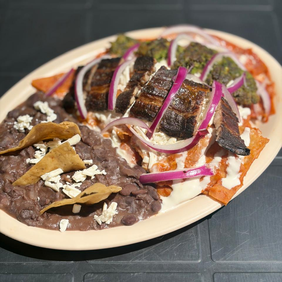 Totopos, Salsa a elegir, Crema, Queso, Cebolla, Proteína y Frijoles.