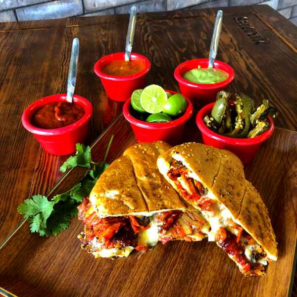 Pimientos, cebolla asada, tocino, queso, tortillas y tu proteína preferida.