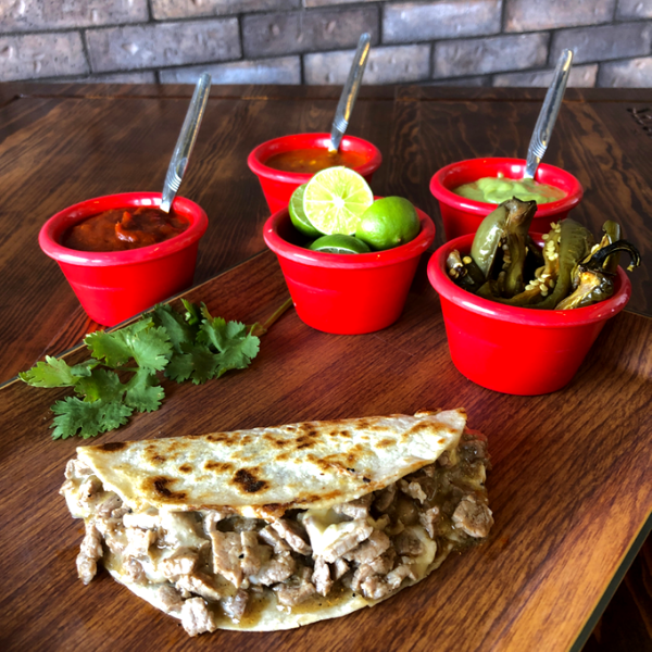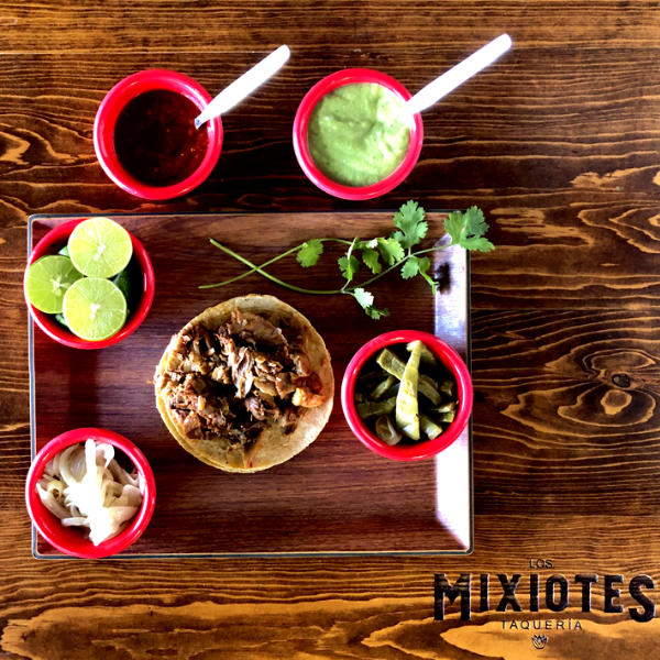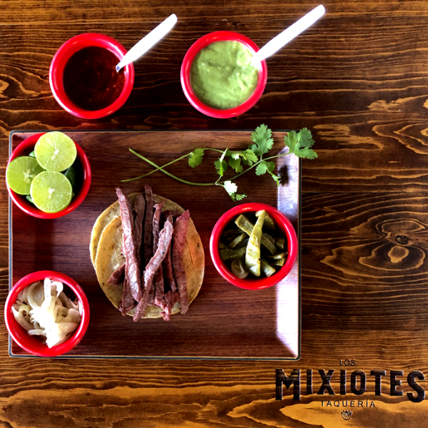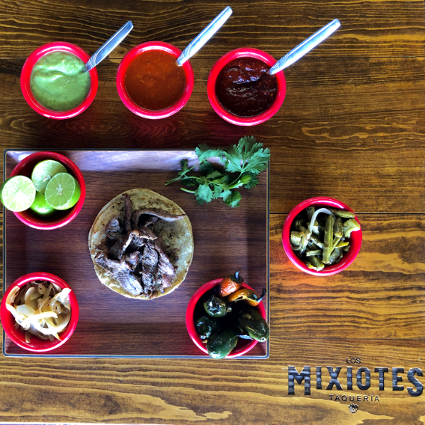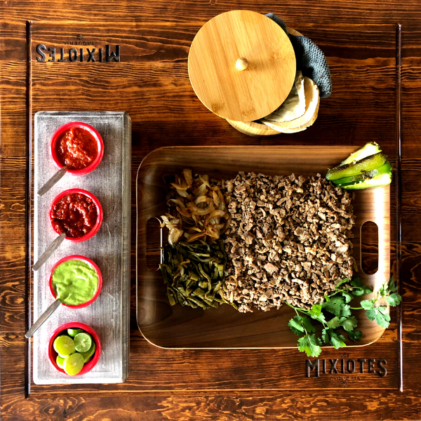 Nopales, cebolla asada, chiles toreados, salsas, limones, tortillas, pastor, bistec adobado, mixiote y chorizo.