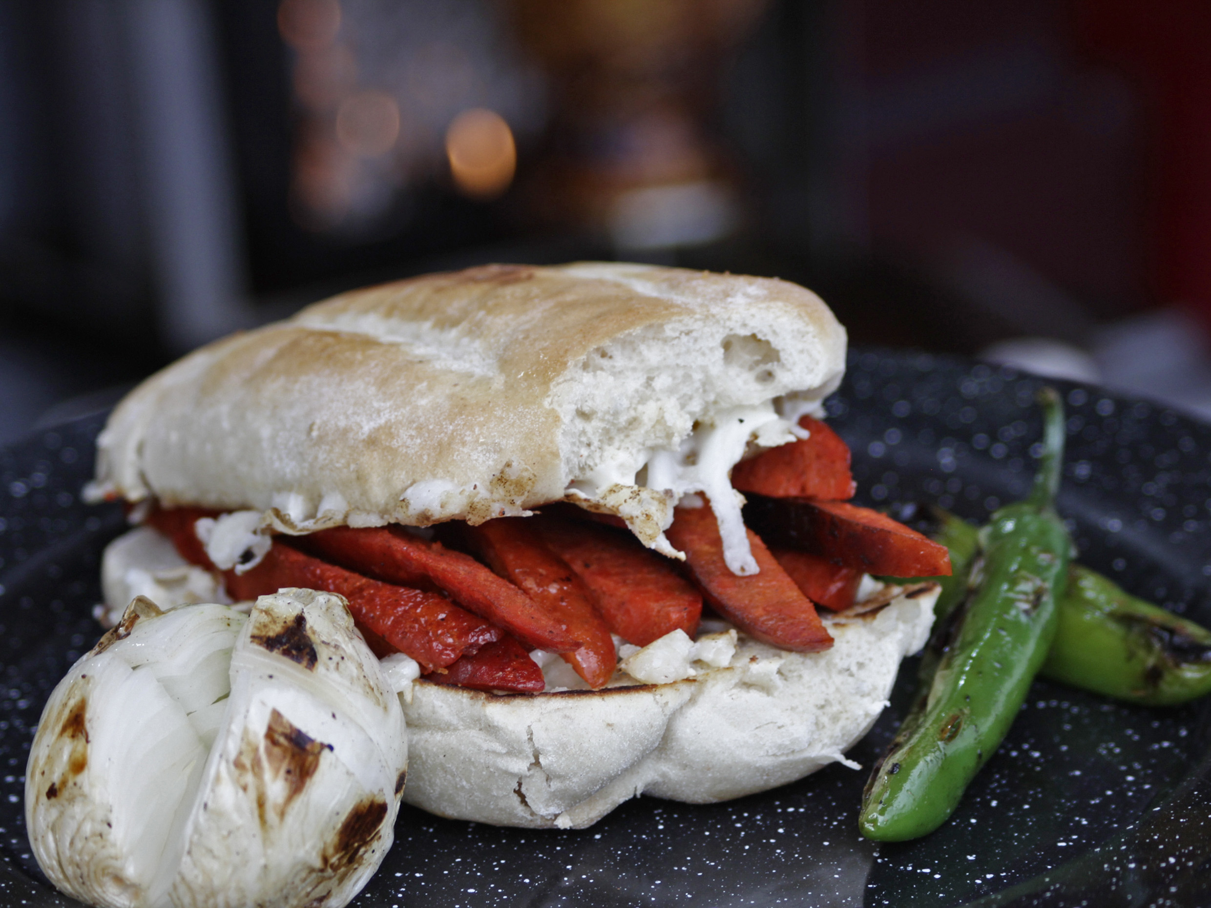 Bolillo del día, con capa de queso además la carne de tu elección. Cebolla asada y papa se vende aparte