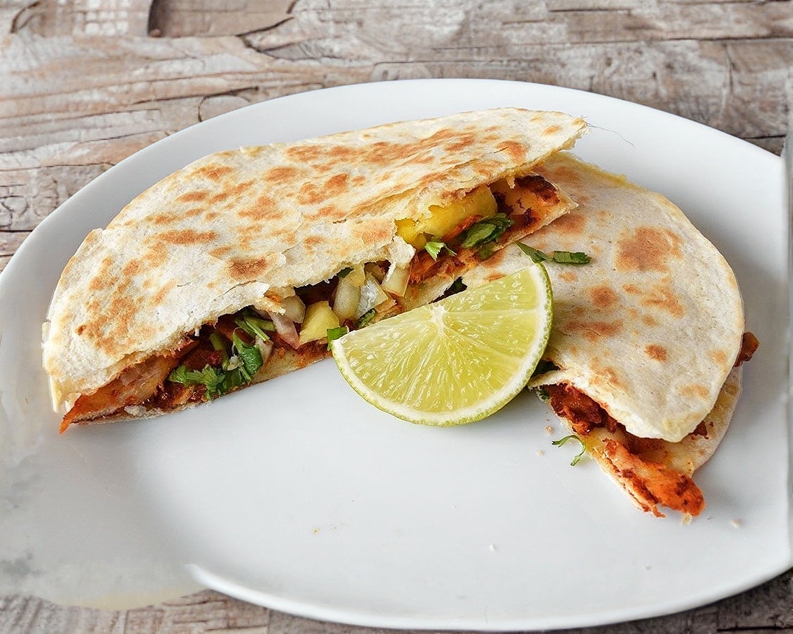 Tortilla de harina, queso blanco, milanesa de pollo, jitomate, aguacate, lechuga y chiles en vinagre ( porción 1 persona)