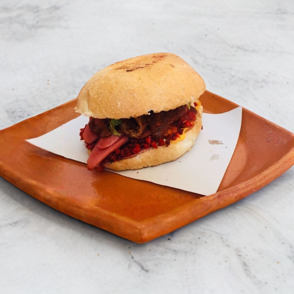Bolillo relleno con totopo, salsa roja, queso, cebolla y bisteck asado y crema (porción 1 persona)