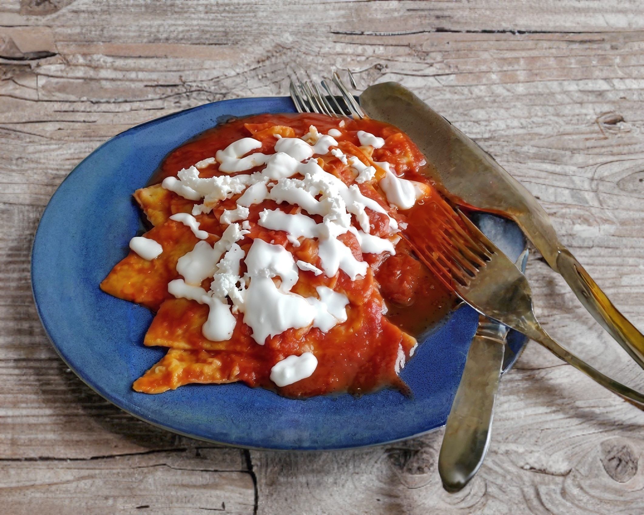 Totopos bañados en salsa roja y acompañado con queso, crema y arroz , frijoles un huevo estrellado y un refresco (Porción personal)