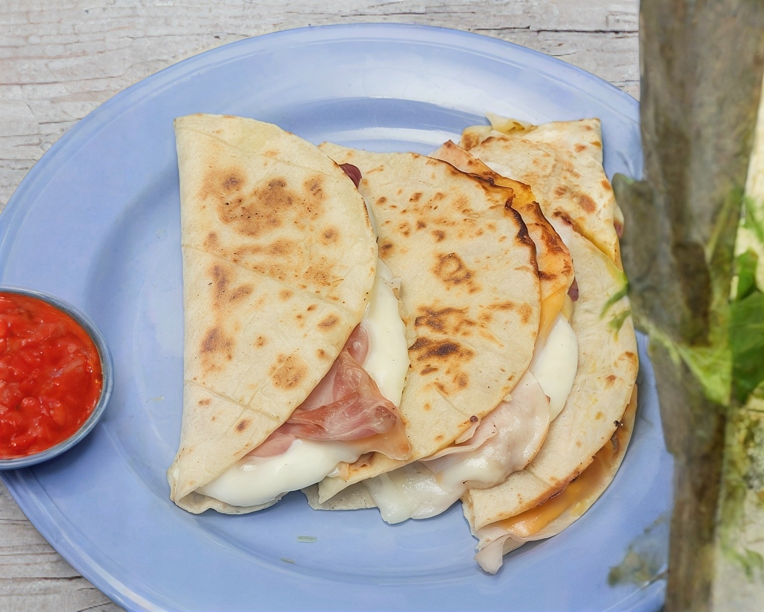 Tortillas de harina, queso blanco, queso amarillo, jamón, milanesa de pollo, lechuga, aguacate, jitomate y chiles en vinagre ( porción 1 persona)