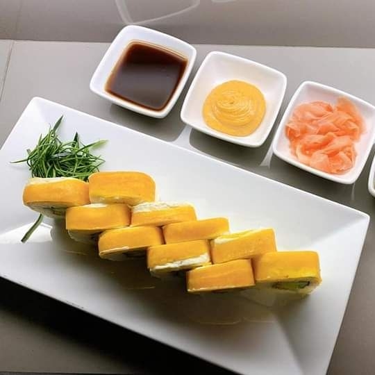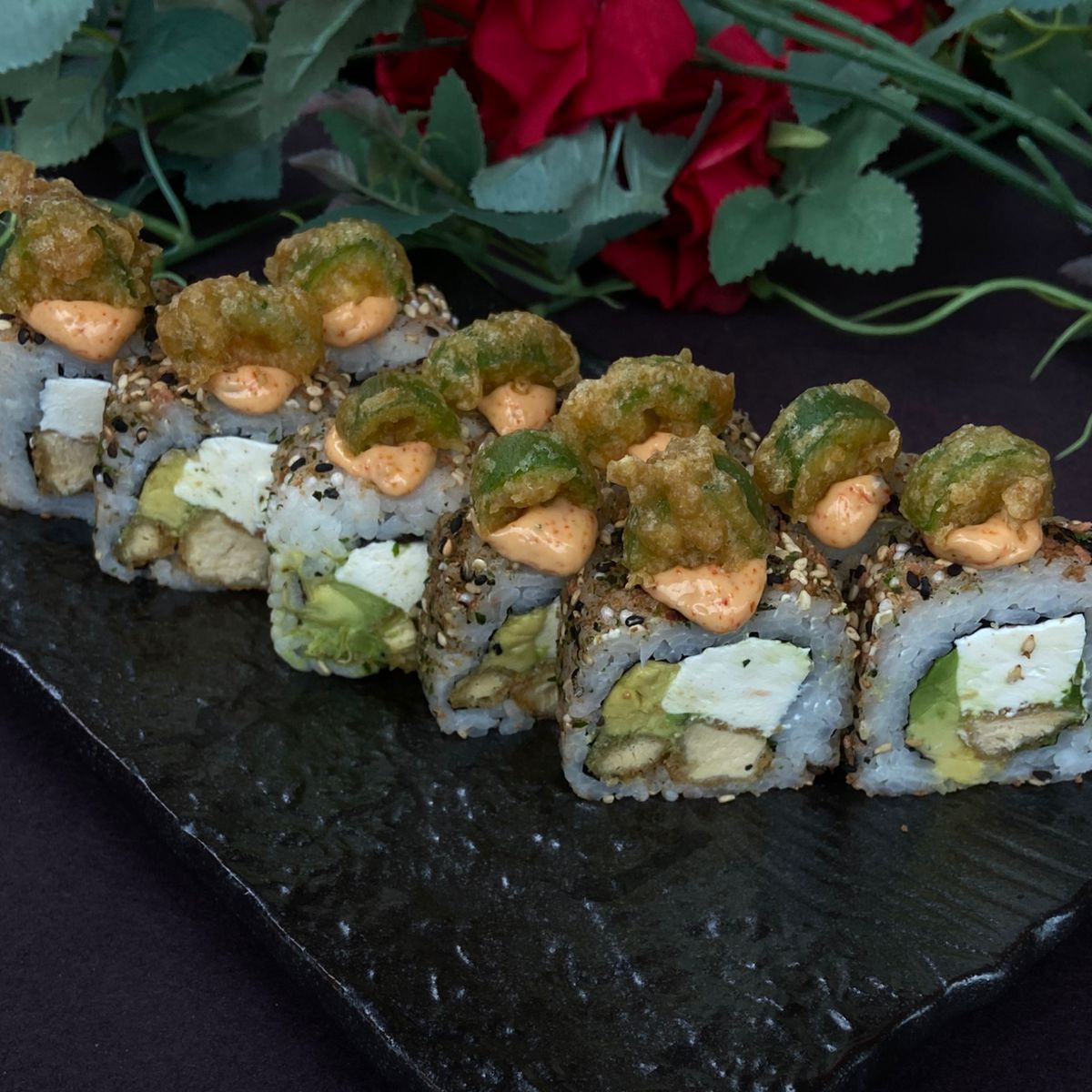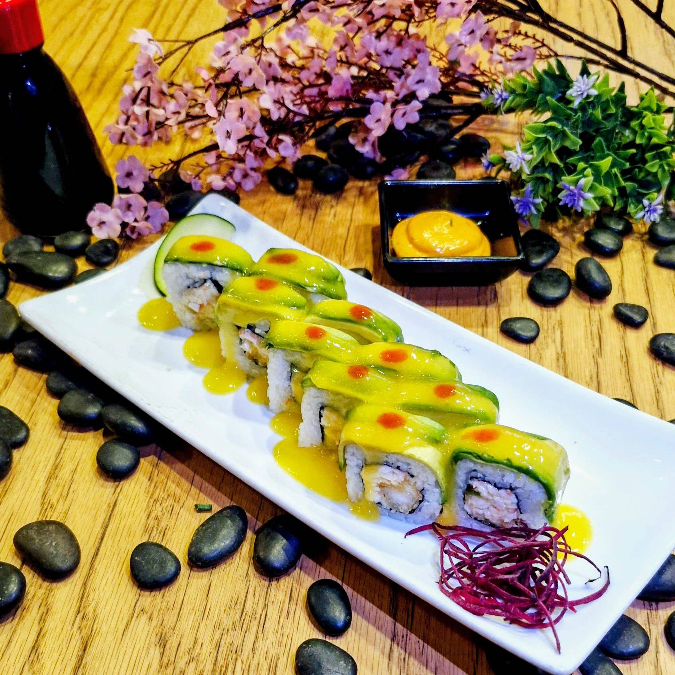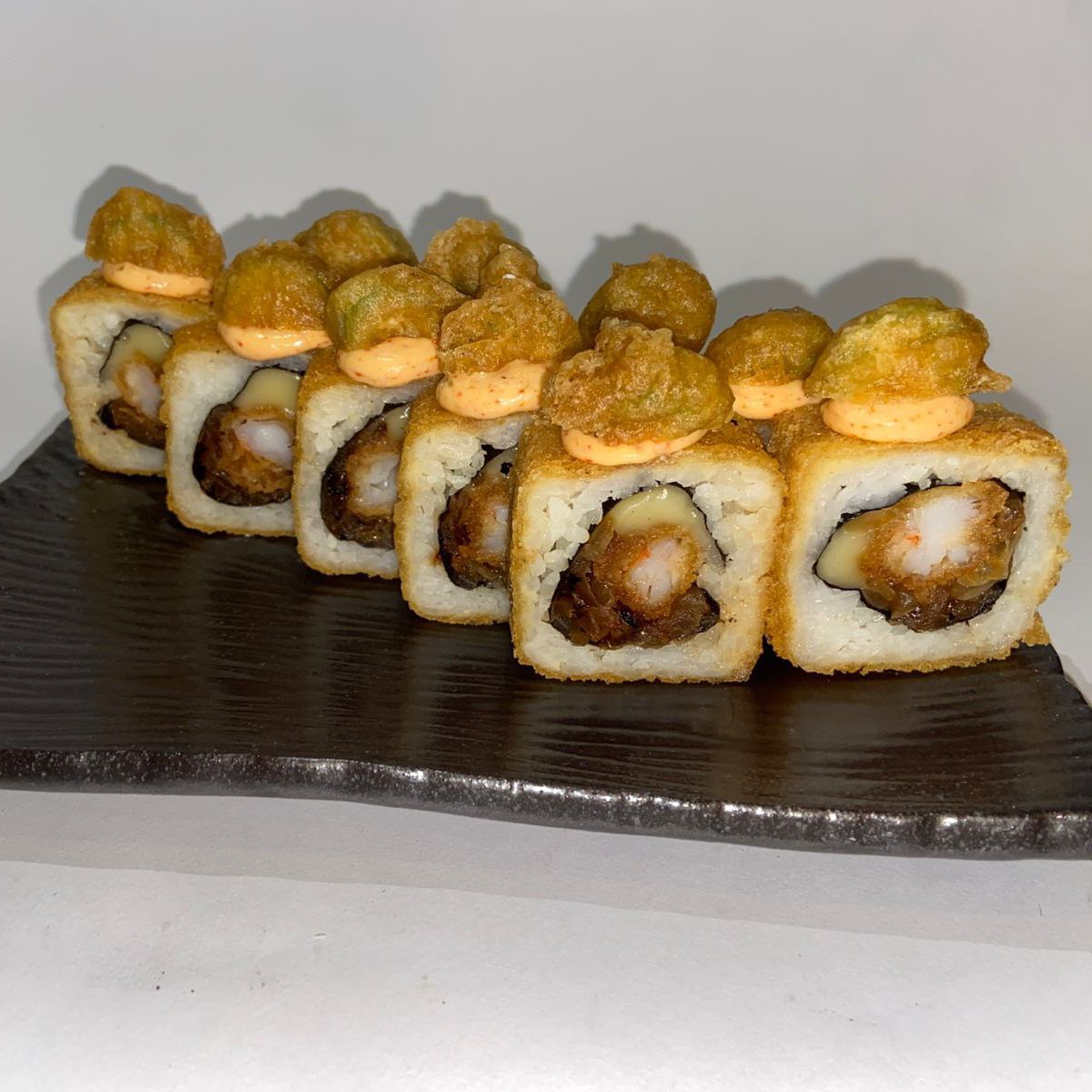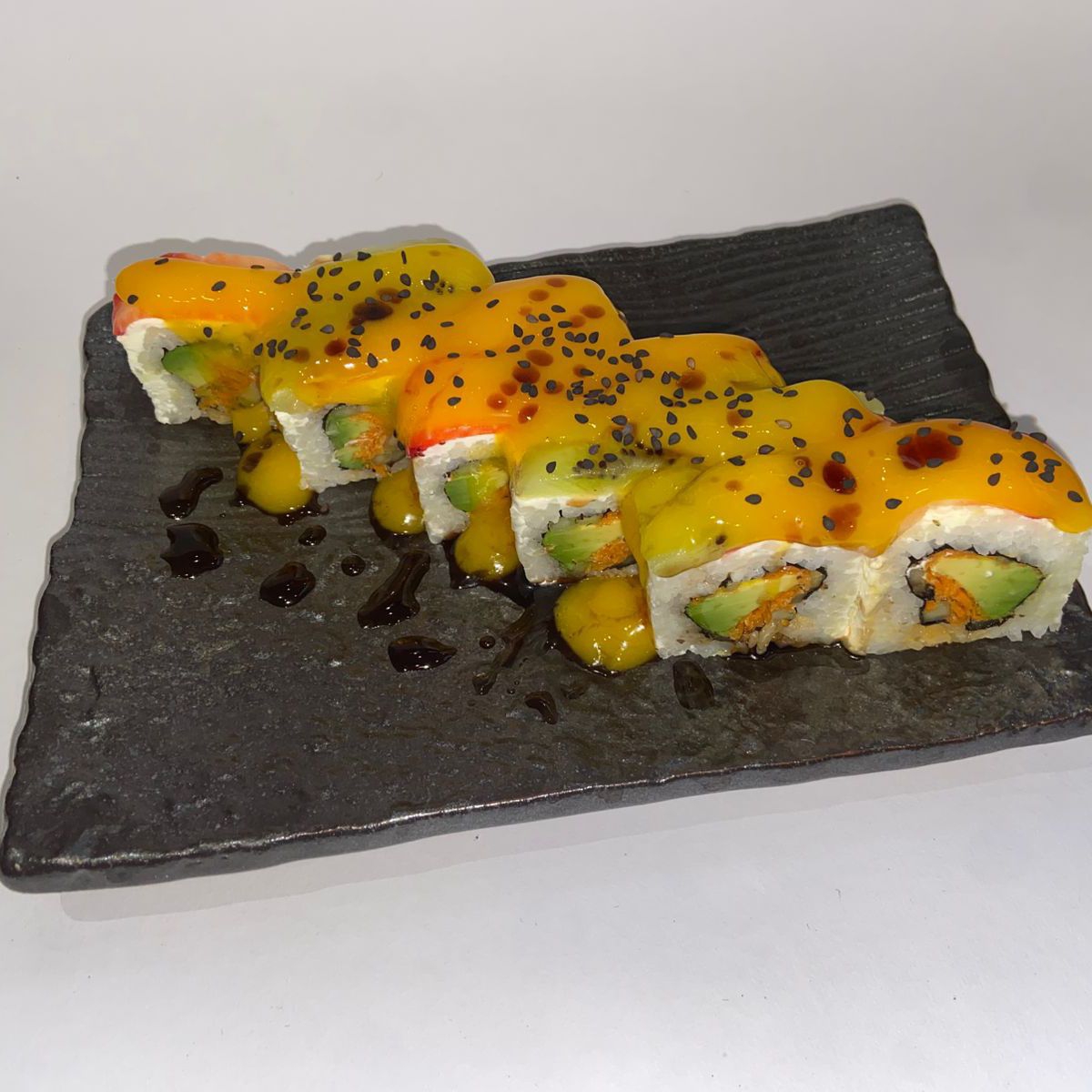Por dentro camarón empanizado y tampico. Por fuera aguacate, salsa de mango y sriracha.