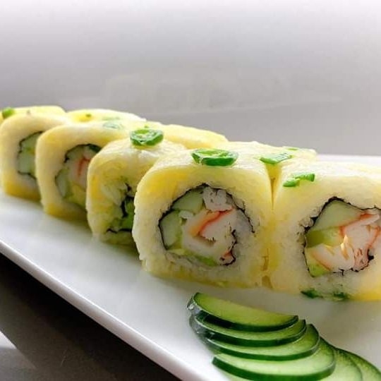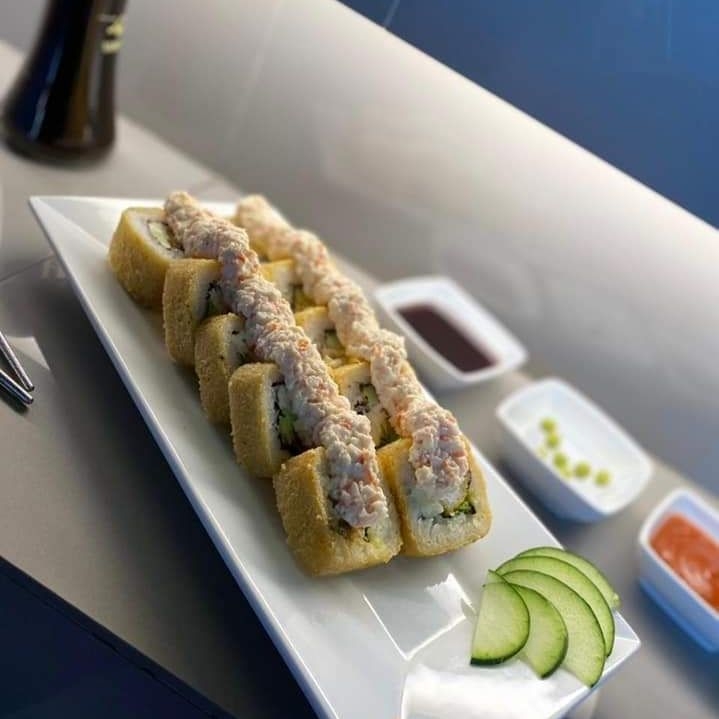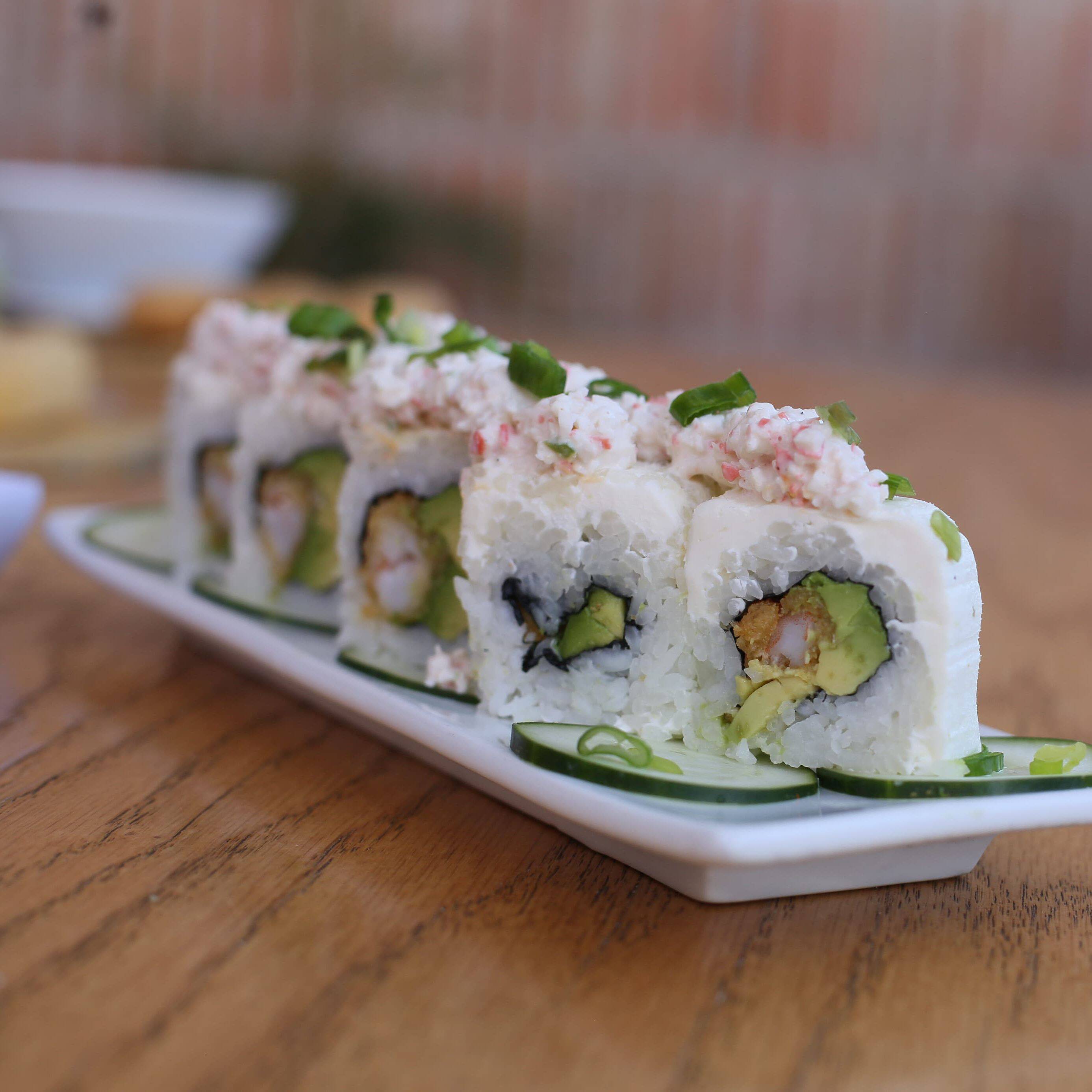 Por dentro pepino y camarón capeado. Por fuera, aguacate y aderezo tampico.