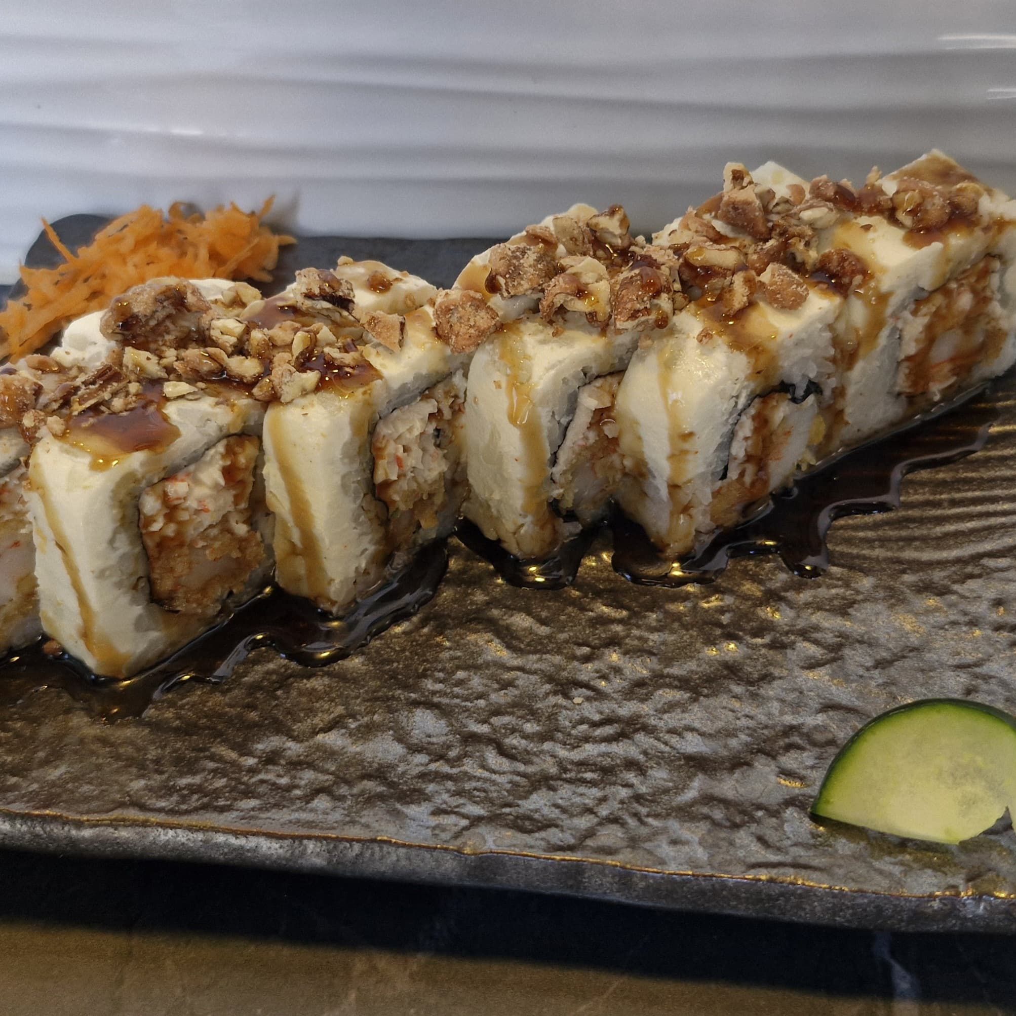 Por dentro pepino y camarón capeado. Por fuera queso crema, plátano macho bañado en salsa de anguila.