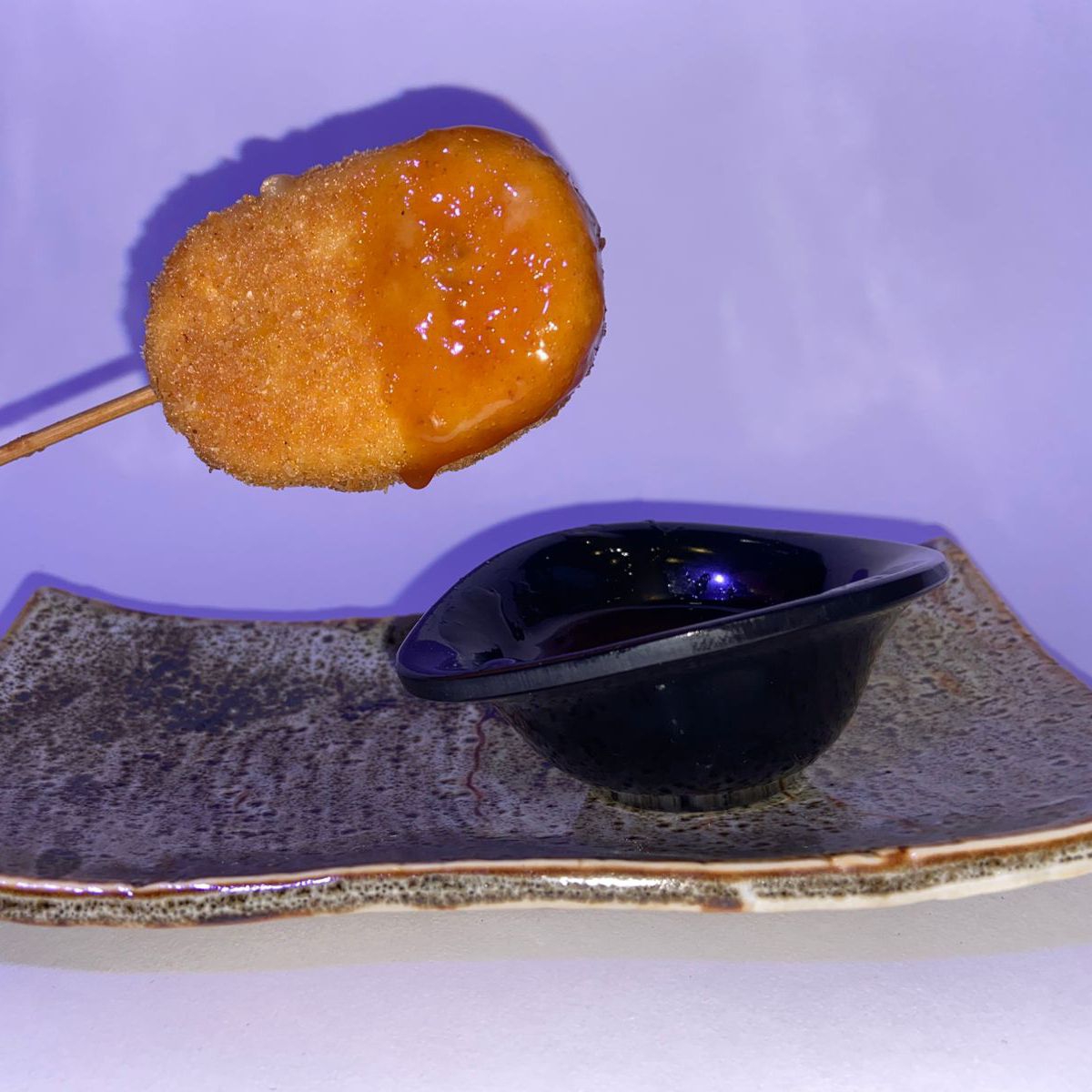 Por dentro cebolla caramelizada, camarón empanizado y queso manchego. Por fuera empanizado, salsa spicy, chiles capeados y salsa teriyaki.