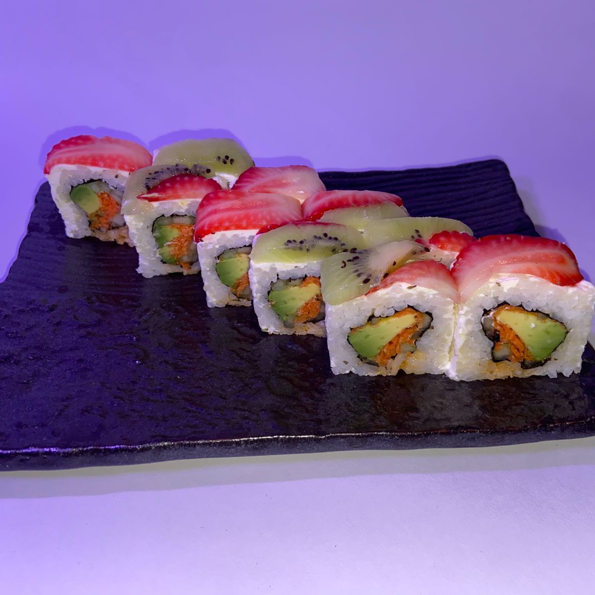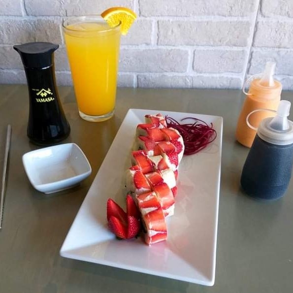 Por dentro salmón fresco, aguacate y pepino. Por queso crema, fresa y salsa de anguila.