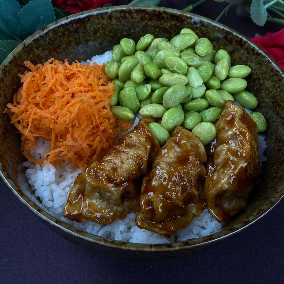 Arroz al vapor con zanahoria, edamames y 3 gyozas de cerdo bañadas en salsa teriyaki.