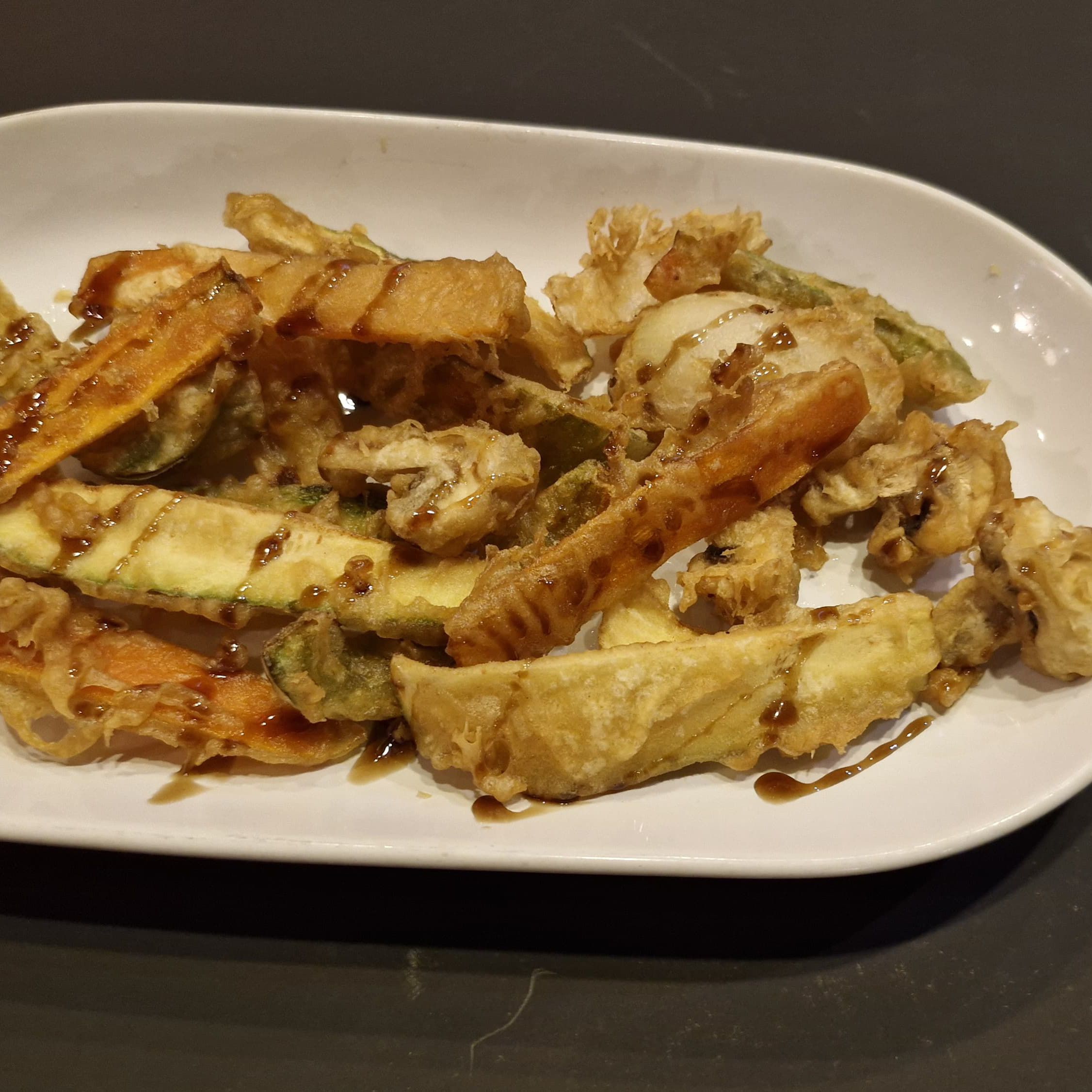 Variedad de verduras capeados como zanahoria, calabaza, cebolla, pimiento y champiñón. Acompañado con salsa de anguila.