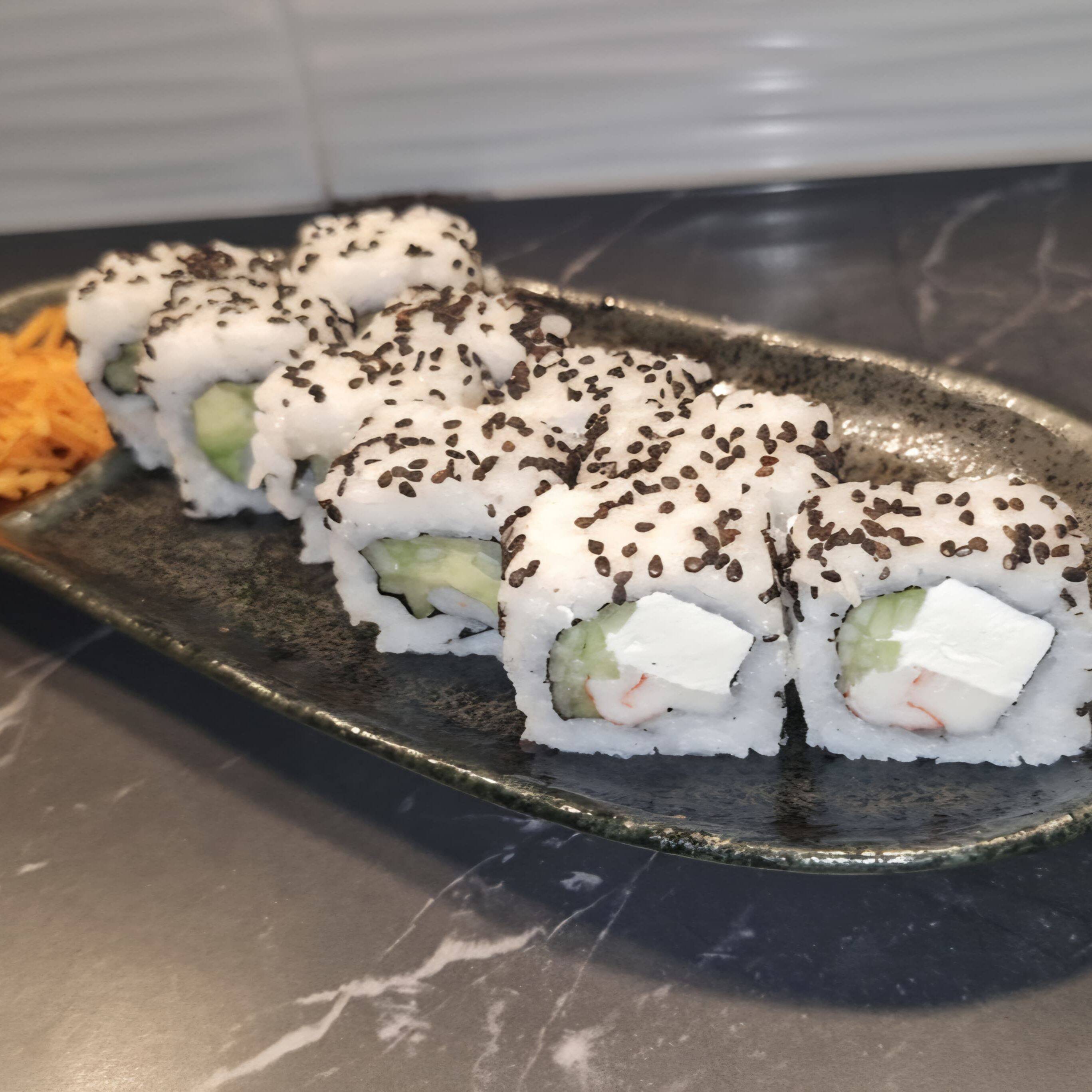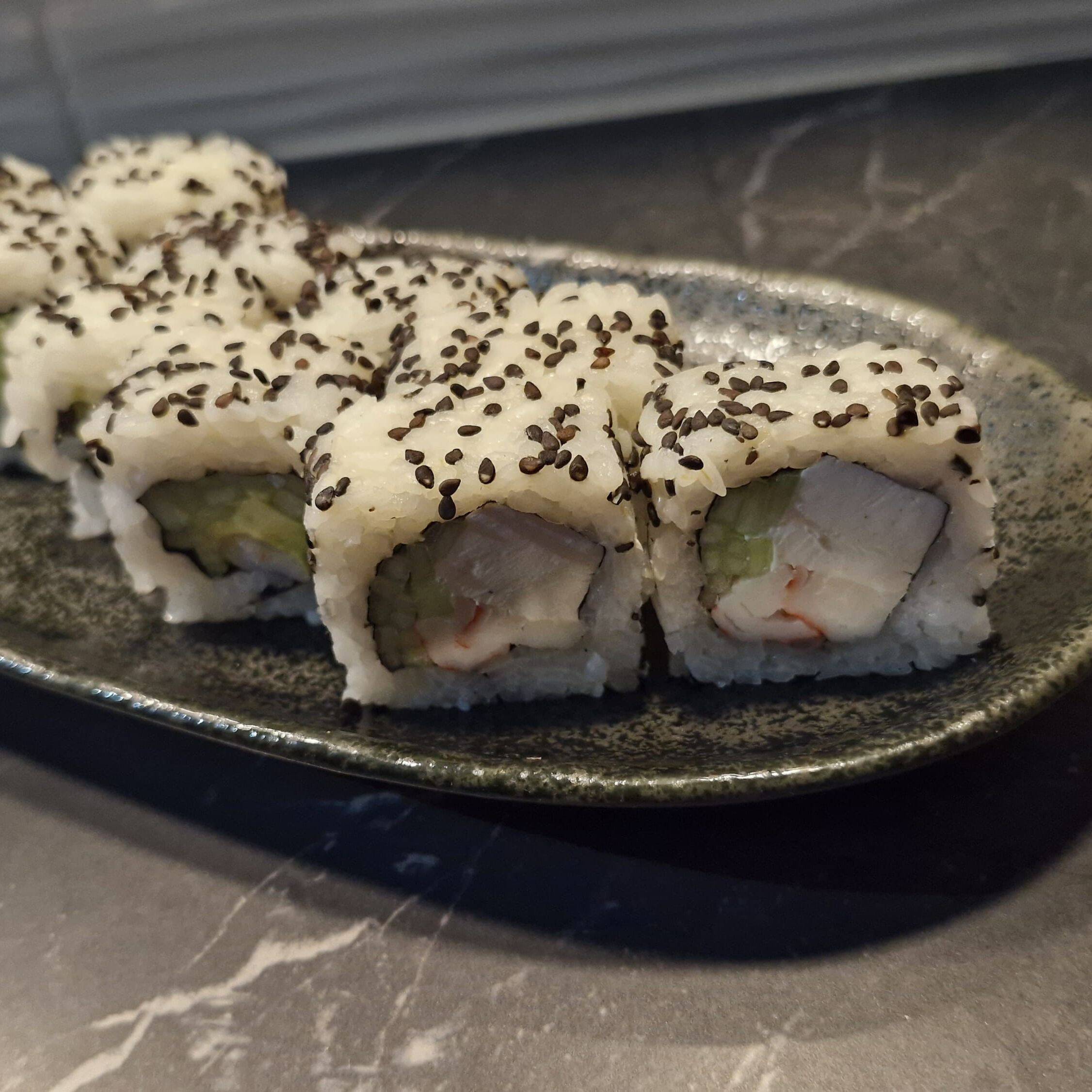 Por dentro, queso crema, salmón fresco y pepino. Por fuera, ajonjolí.