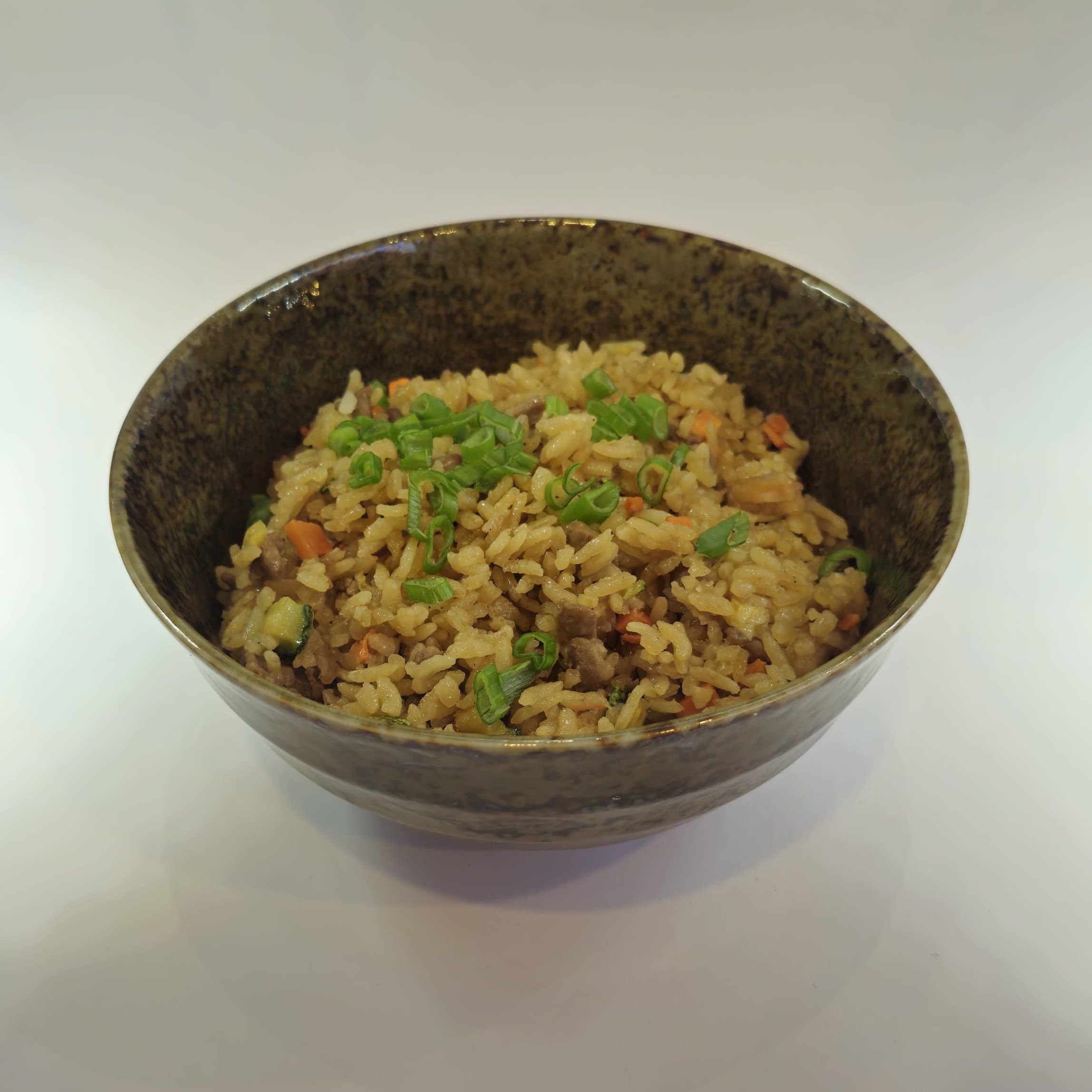 Arroz frito con zanahoria, calabaza, camarones y res.
