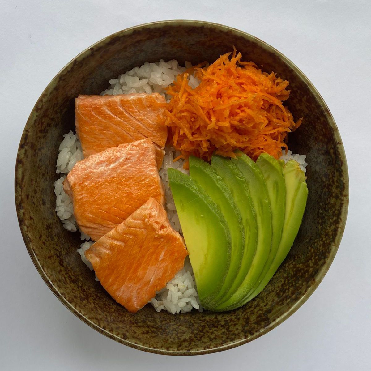 Arroz al vapor con salmón a la plancha, zanahoria y aguacate.