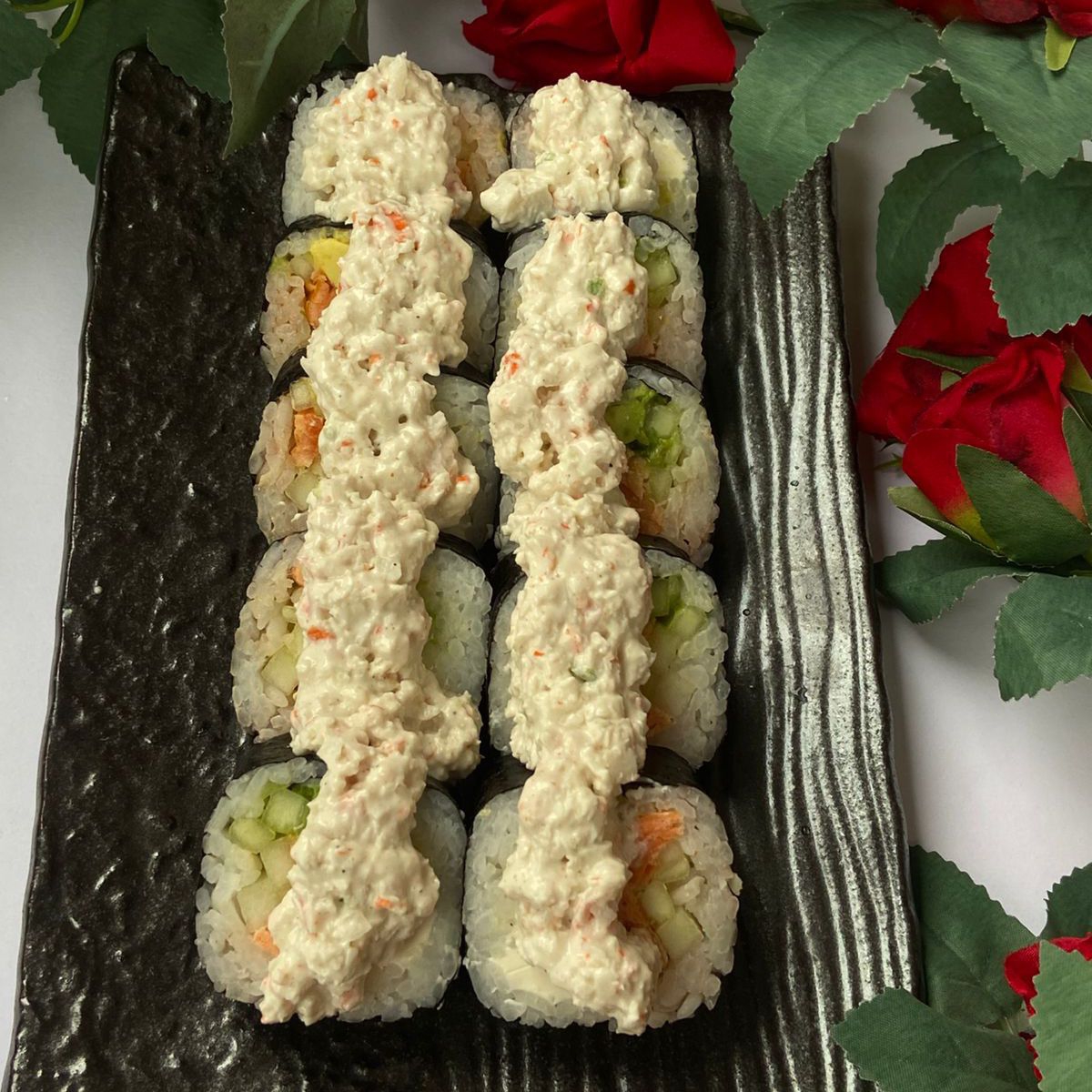 Por dentro camarón empanizado y tampico serrano especial. Por dentro cebolla caramelizada, camarón empanizado y queso manchego. Por fuera, empanizado, salsa spicy, chiles capeados, salsa teriyaki y kiwi paradiso. Por dentro zanahoriam pepino y aguacate. Por fuera, queso crema, kiwi, salsa de mango, salsa de anguila y ajonjolí. Por fuera, queso crema, nuez caramelizada y bañado en salsa de anguila.