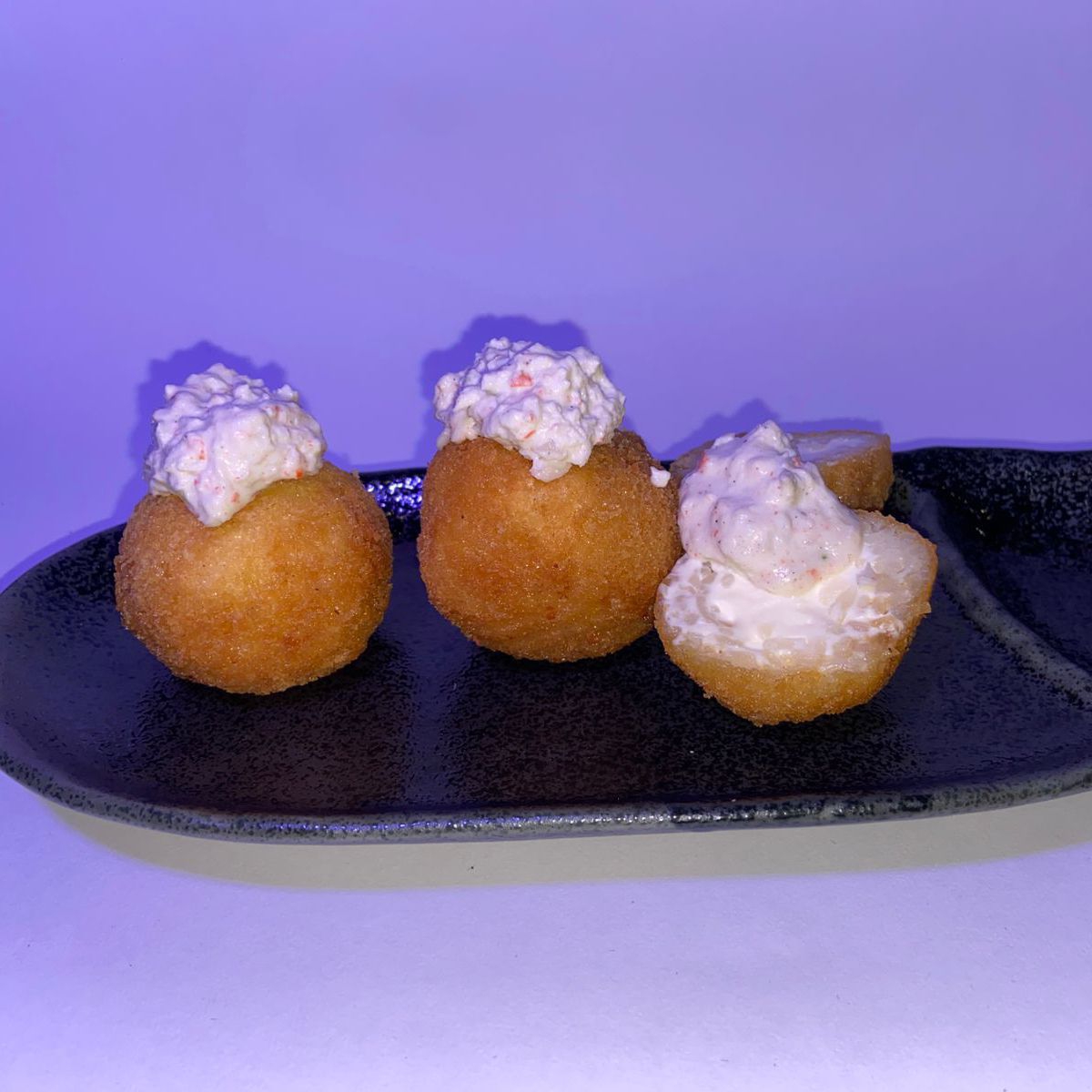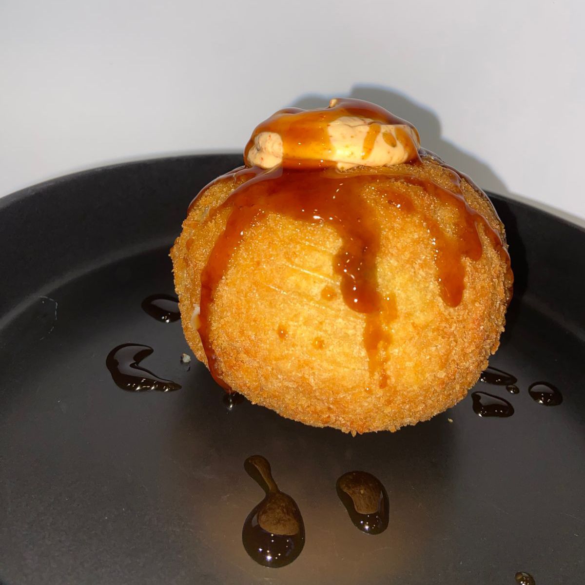 Por dentro queso manchego gratinado, cebolla caramelizada. Por fuera aguacate, salsa spicy y ajonjolí.