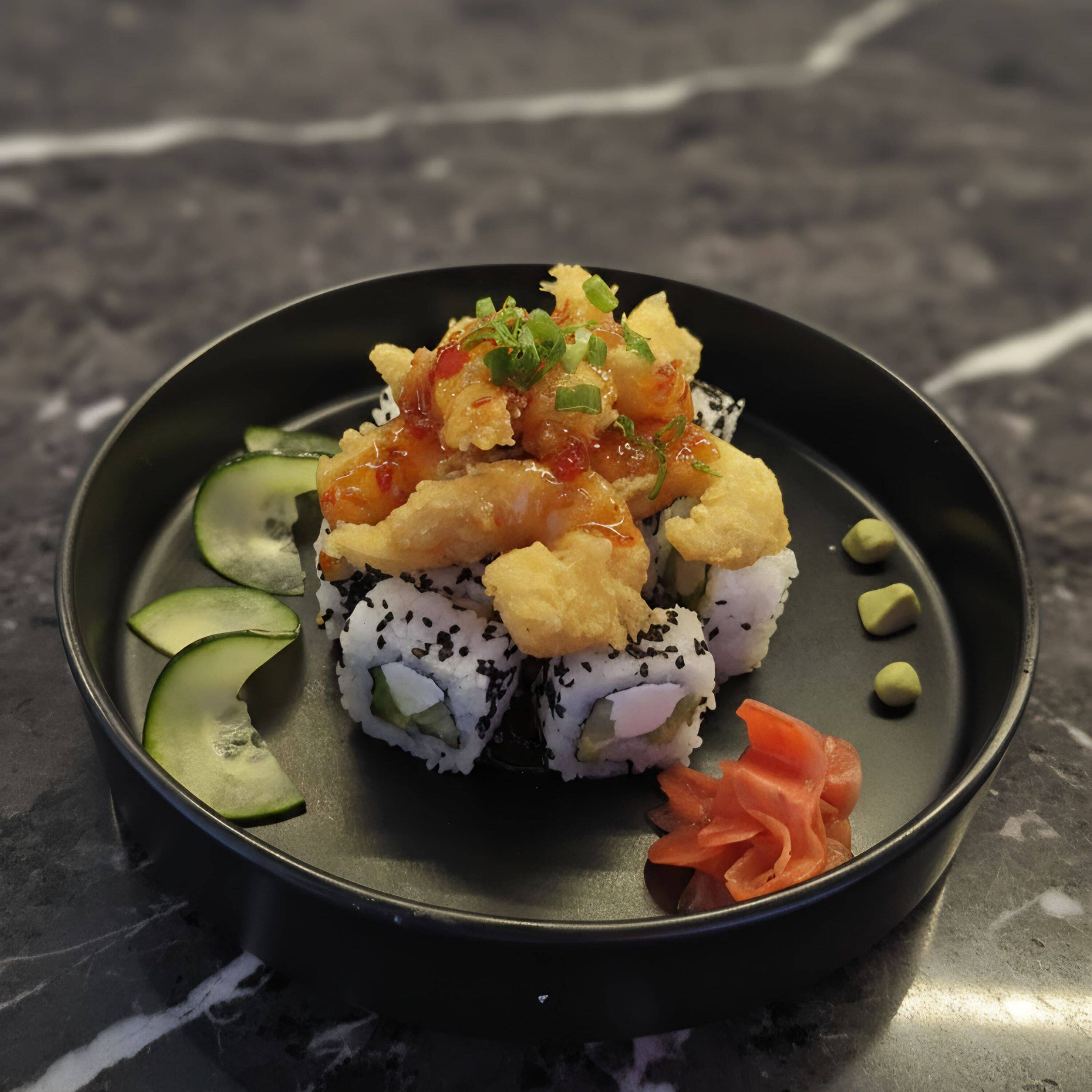 Por dentro yakimeshi, queso crema, aguacate, pollo empanizado y por fuera capeado con aderezo tampico.