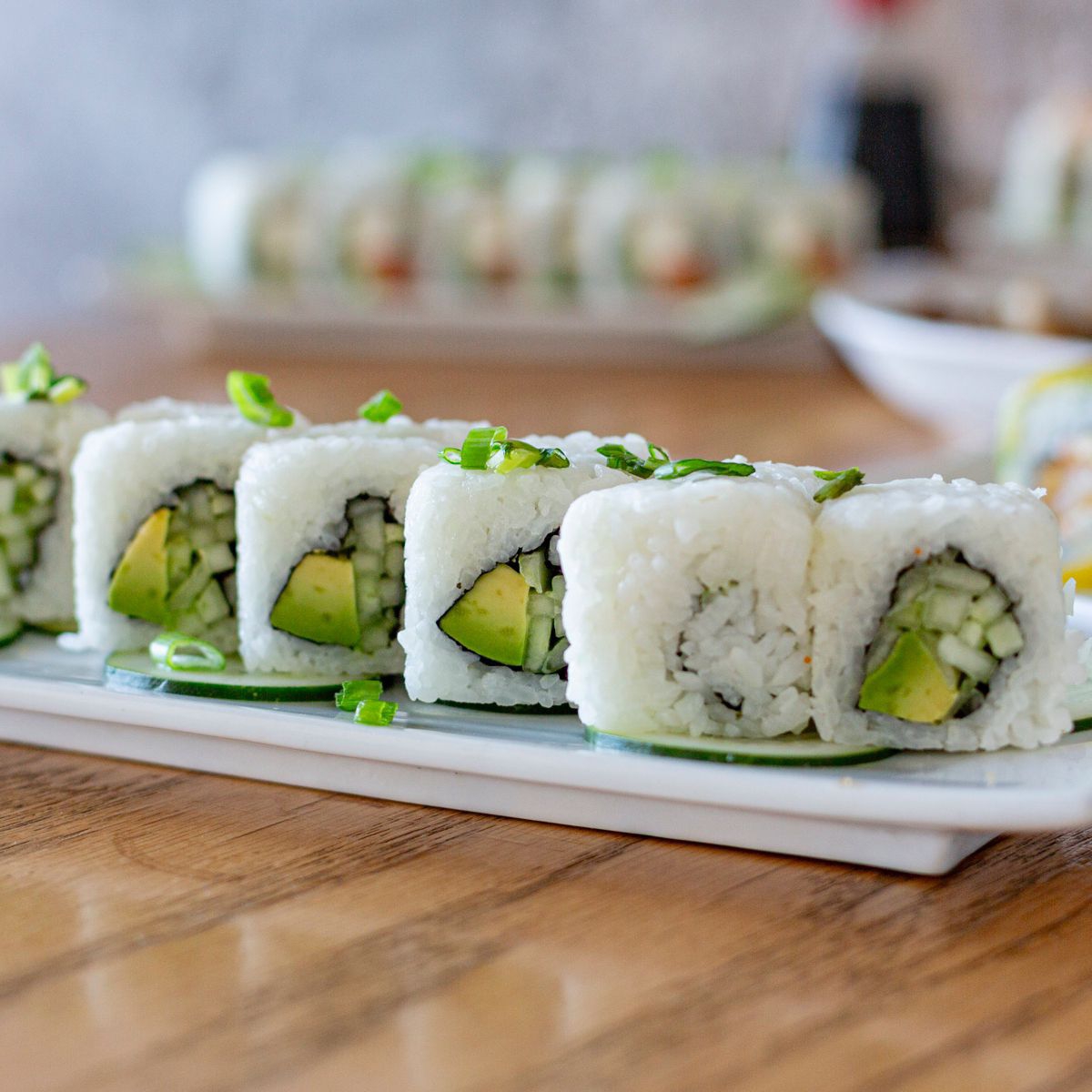 Por dentro pepino, aguacate y camarón cocido. Por fuera, ajonjolí.