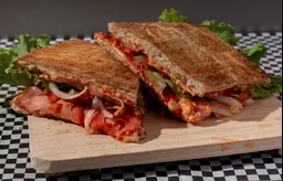 Pizza de 35 cms, Masa delgada artesanal sin borde pero más queso en la orilla, tocineta, cebolla, chorizo y jalapeño.