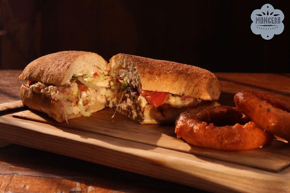 Pan artesanal a elegir: hierbas finas o ajo. Preparado con mantequilla de hierbas, fresca lechuga, jitomate, crema de ajo, mezcla de quesos de la casa, acompañado con aros de cebolla