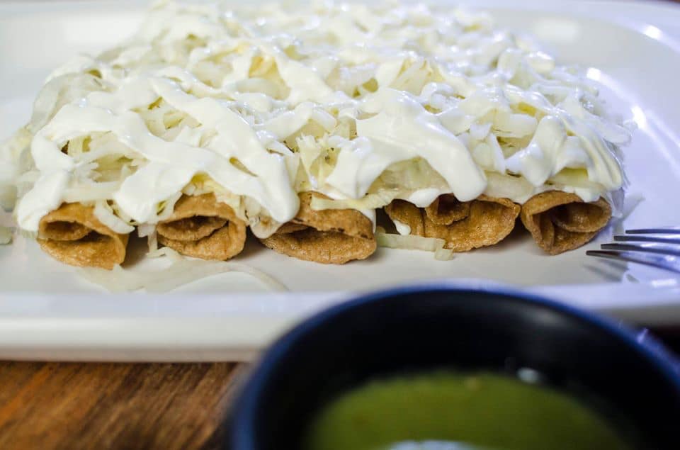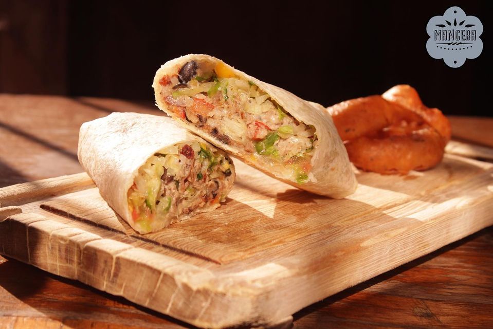 Arroz, frijoles negros enteros, fresca lechuga, jitomate, mezcla de quesos envueltos en una deliciosa tortilla de harina hecha a mano, acompañado con aros de cebolla