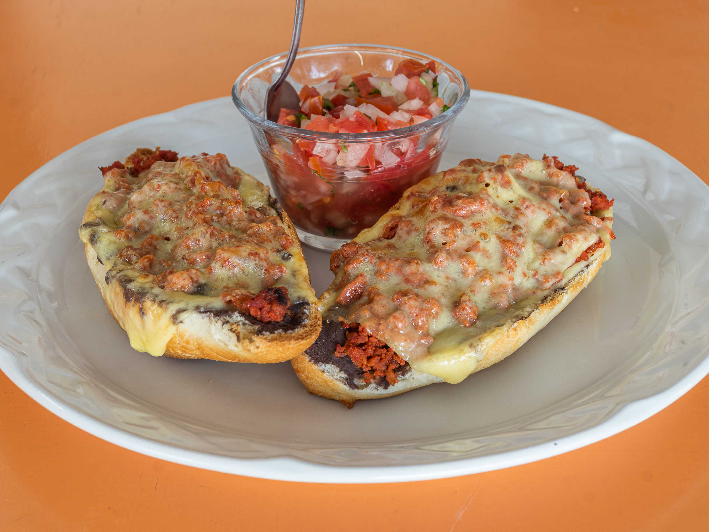 2 pzas Grandes de pan bolillo con frijoles refritos y queso manchego, servidos con jamon o chorizo o champiñones acompañados de pico de gallo