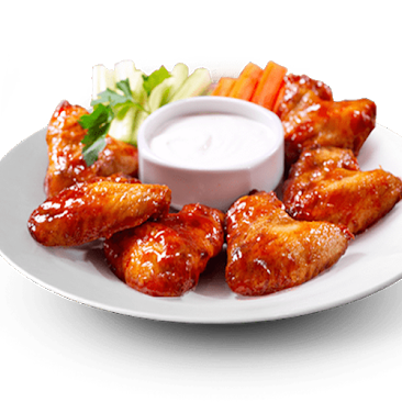 ALITAS CON PORCION DE PAPAS FRITAS AROS DE CEBOLLA Y CRUDITES ACOMPAÑADOS DE ADEREZO RANCH