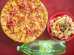 1 pizza grande de 3 ingredientes, nachos y 1 refresco de 2 l.