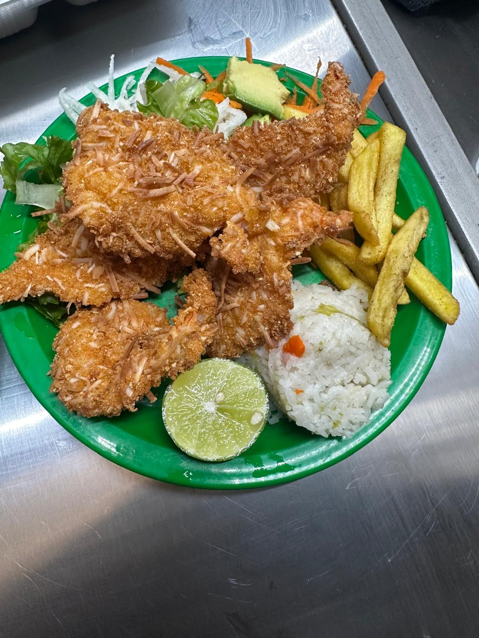 5 Camarones talla 21/25 (160-170 g): Empanizados con coco rallado (aderezo mostaza con miel). Guarnición: Arroz, papa natural y ensalada.