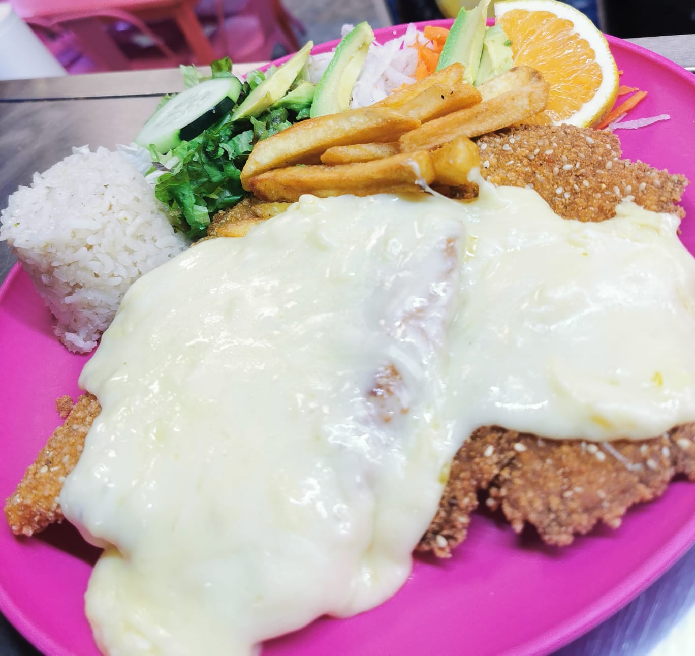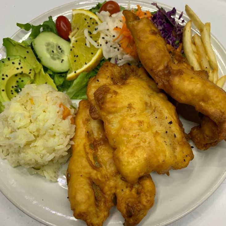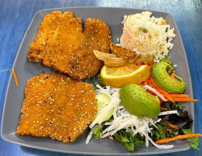 170 g de Filete Empanizado también con Ajonjolí. Guarnición: Arroz, papa natural y ensalada.