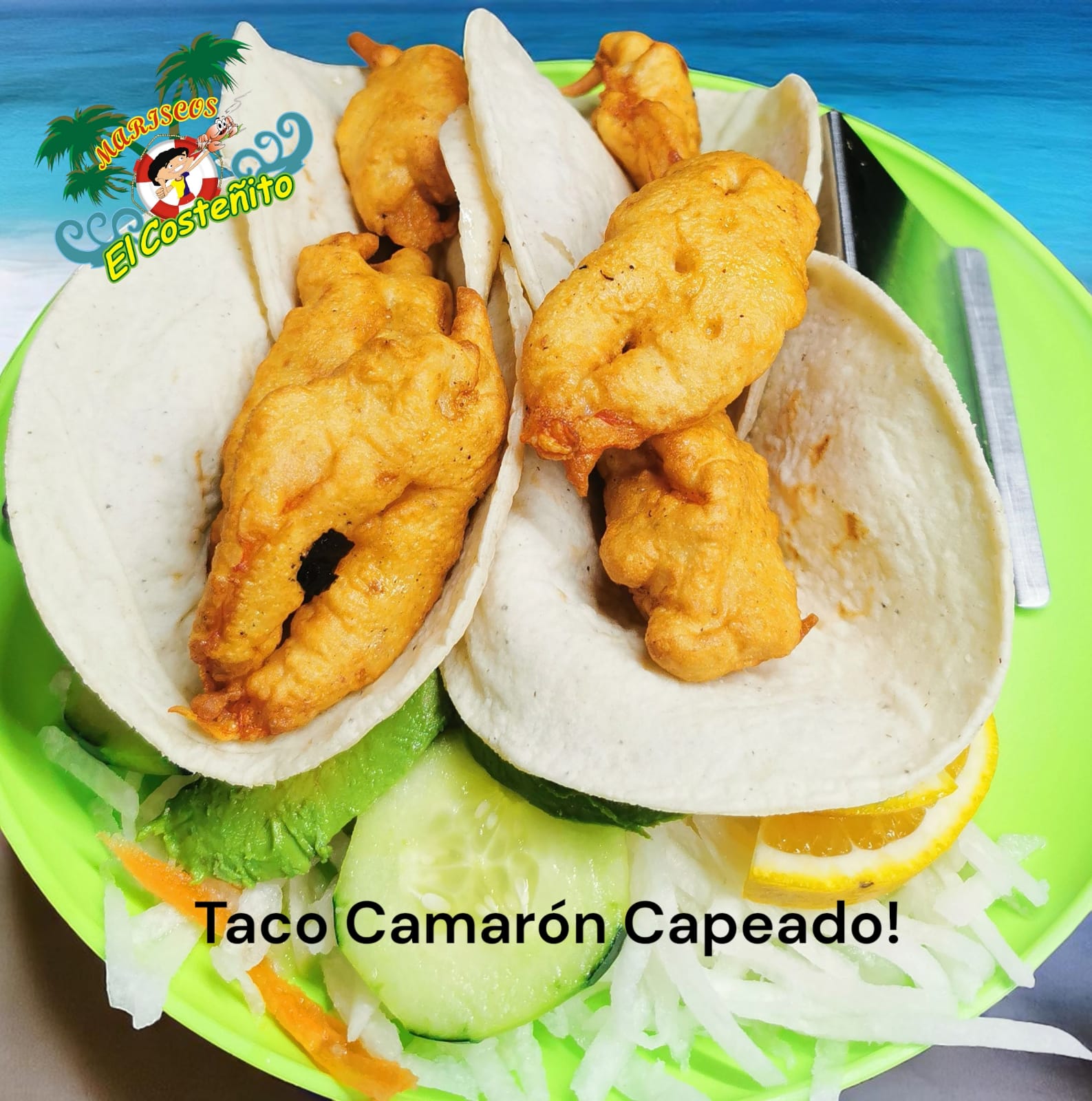 Tortilla de maíz, camarón capeado y ensalada.