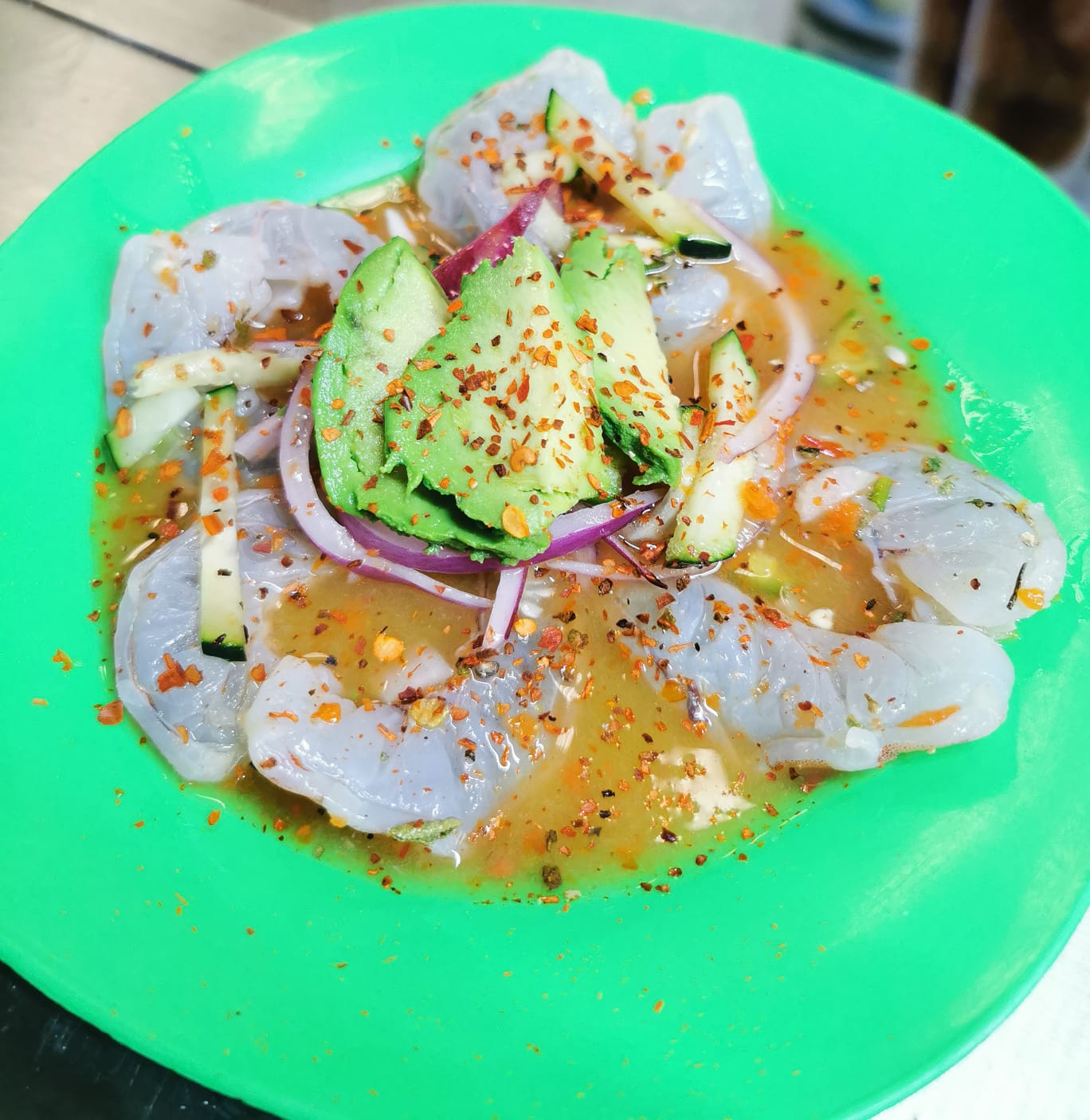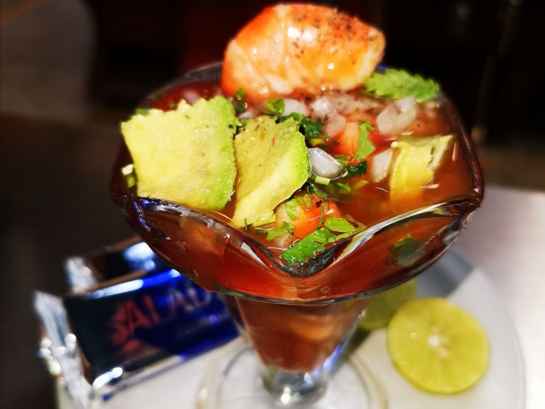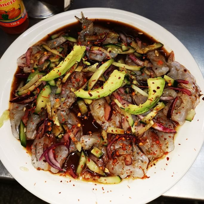 Camarón crudo cocido en limón, pepino, cebolla morada, chile habanero y pimienta.