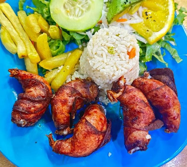 5 Camarones talla 21/25 (180-190 g): Rellenos con Queso y envueltos en tocino. Guarnición: Arroz, papa Francesa y ensalada.