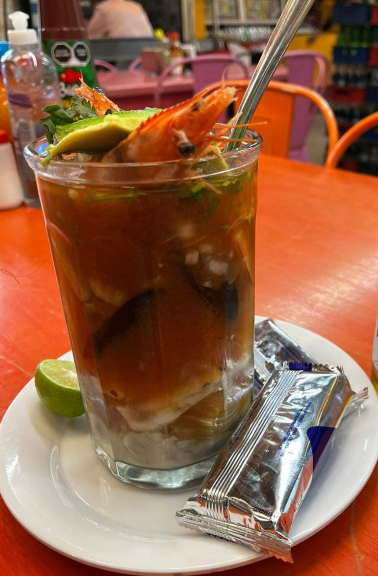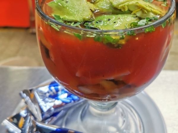 6 Camarones talla 21/25 (125-140 g): Cocidos en limón, pepino, cebolla, salsas negras y toque de pimienta y habanero.